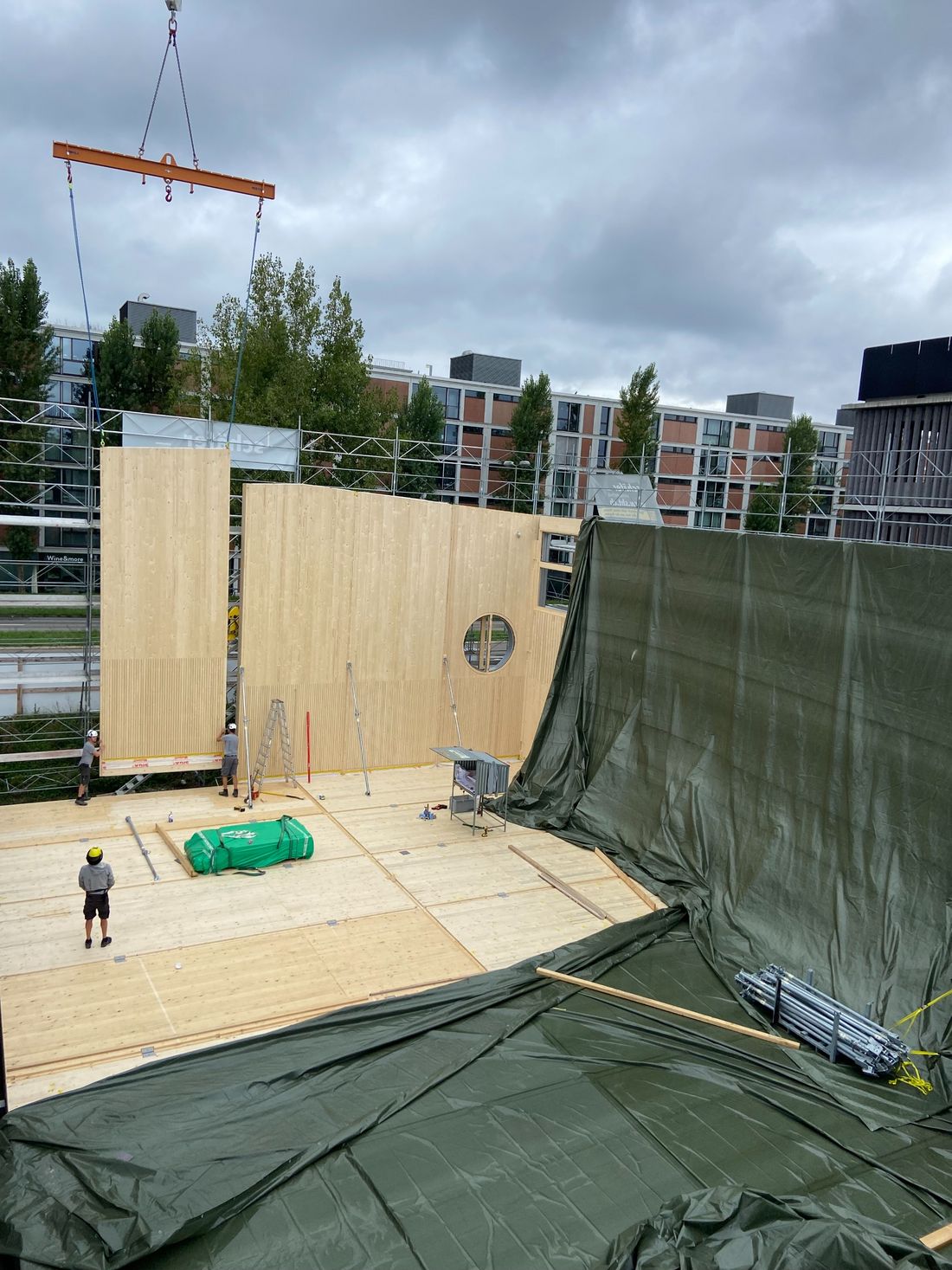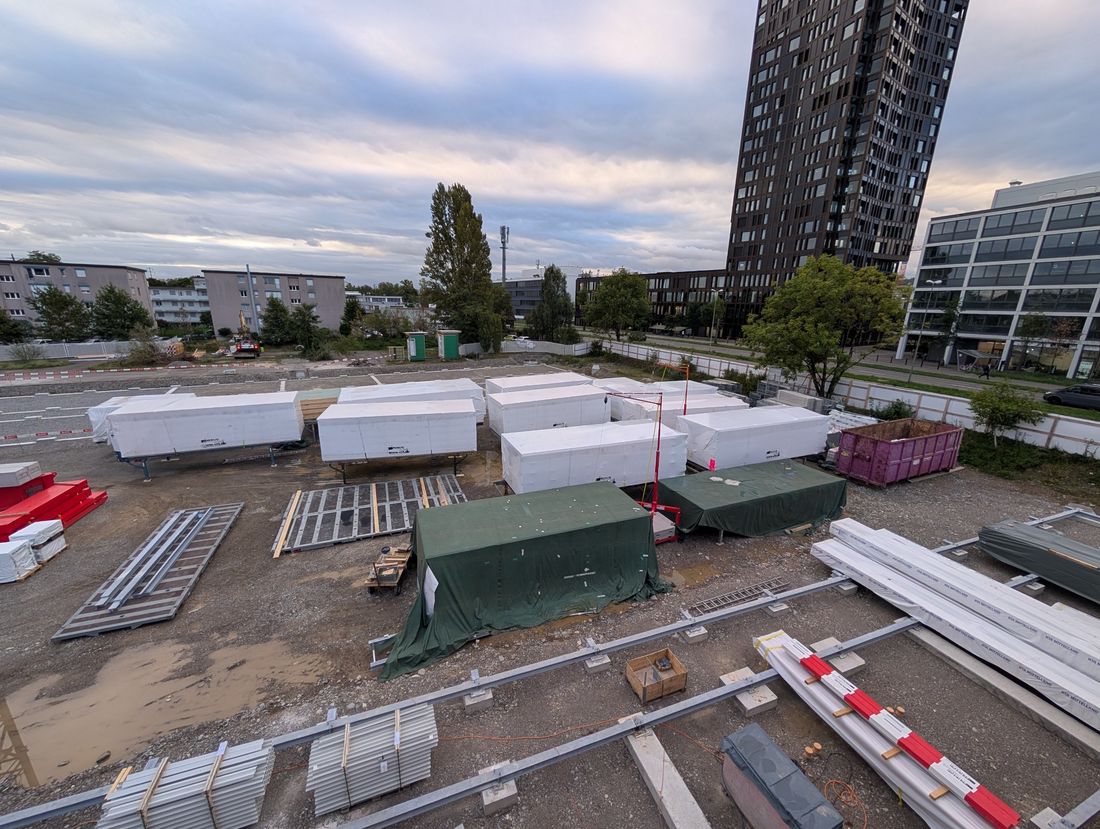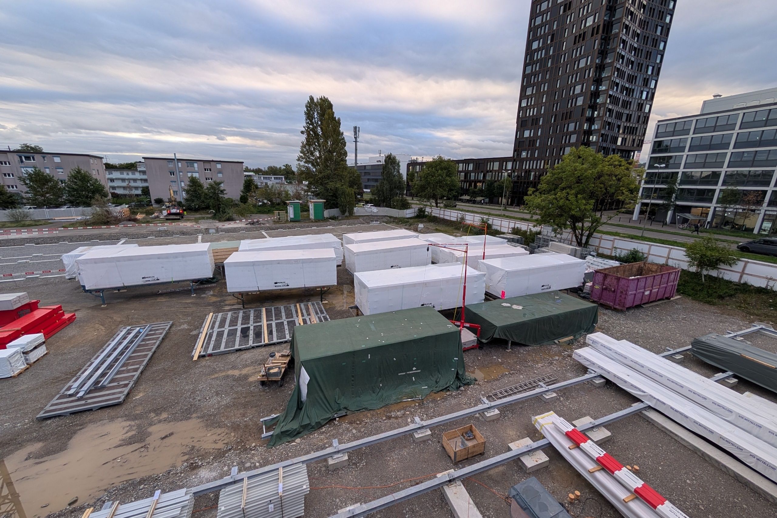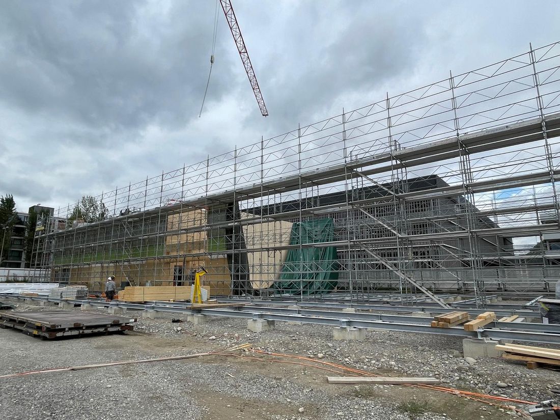 39 Pritschen voller Holzelemente haben wir geliefert – Material für ein besonderes Bauprojekt: Auf dem Gelände der Kantonsschule Stadelhofen (Filiale Dübendorf) entsteht eine temporäre Doppelsporthalle aus Holz.