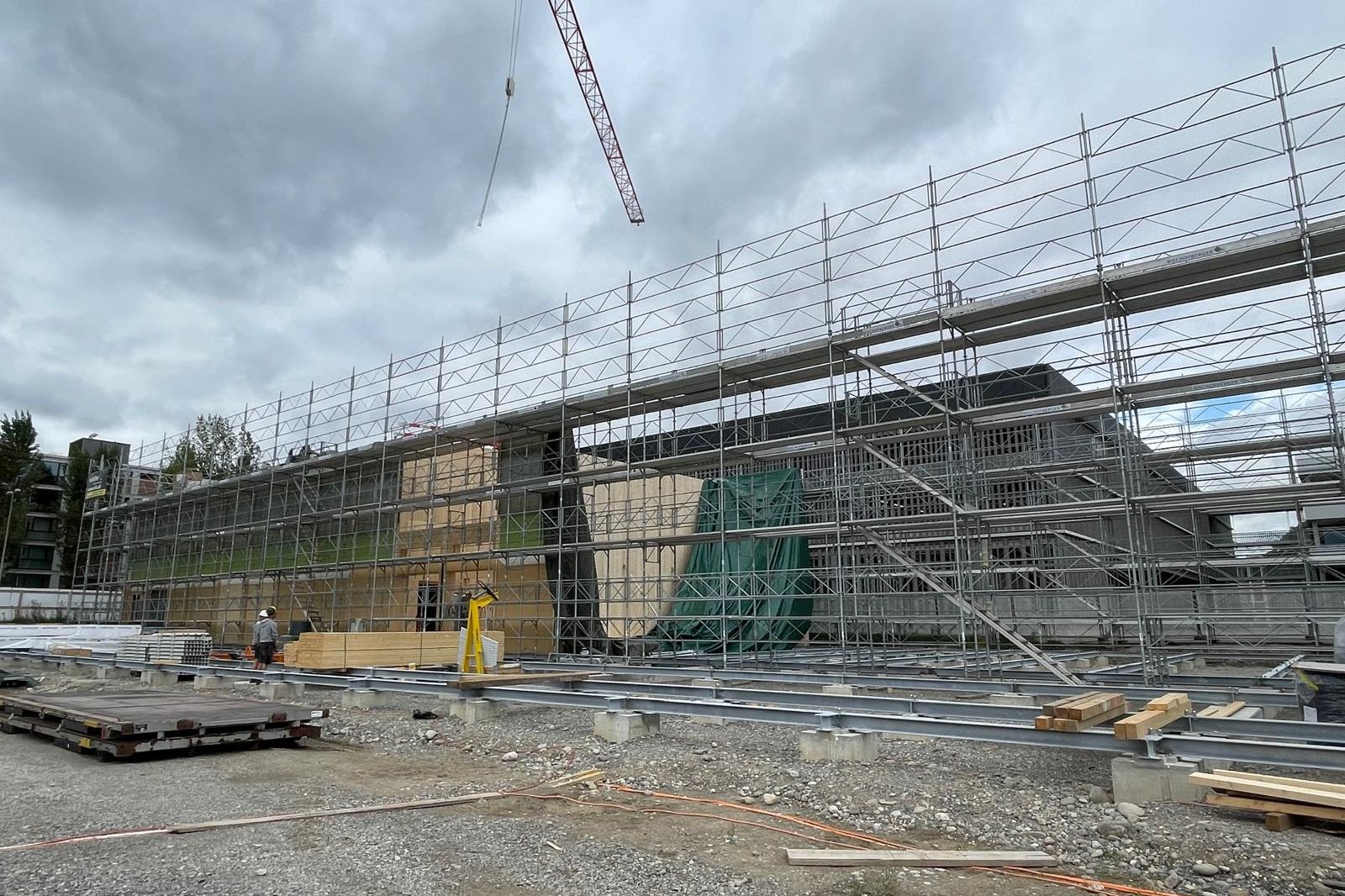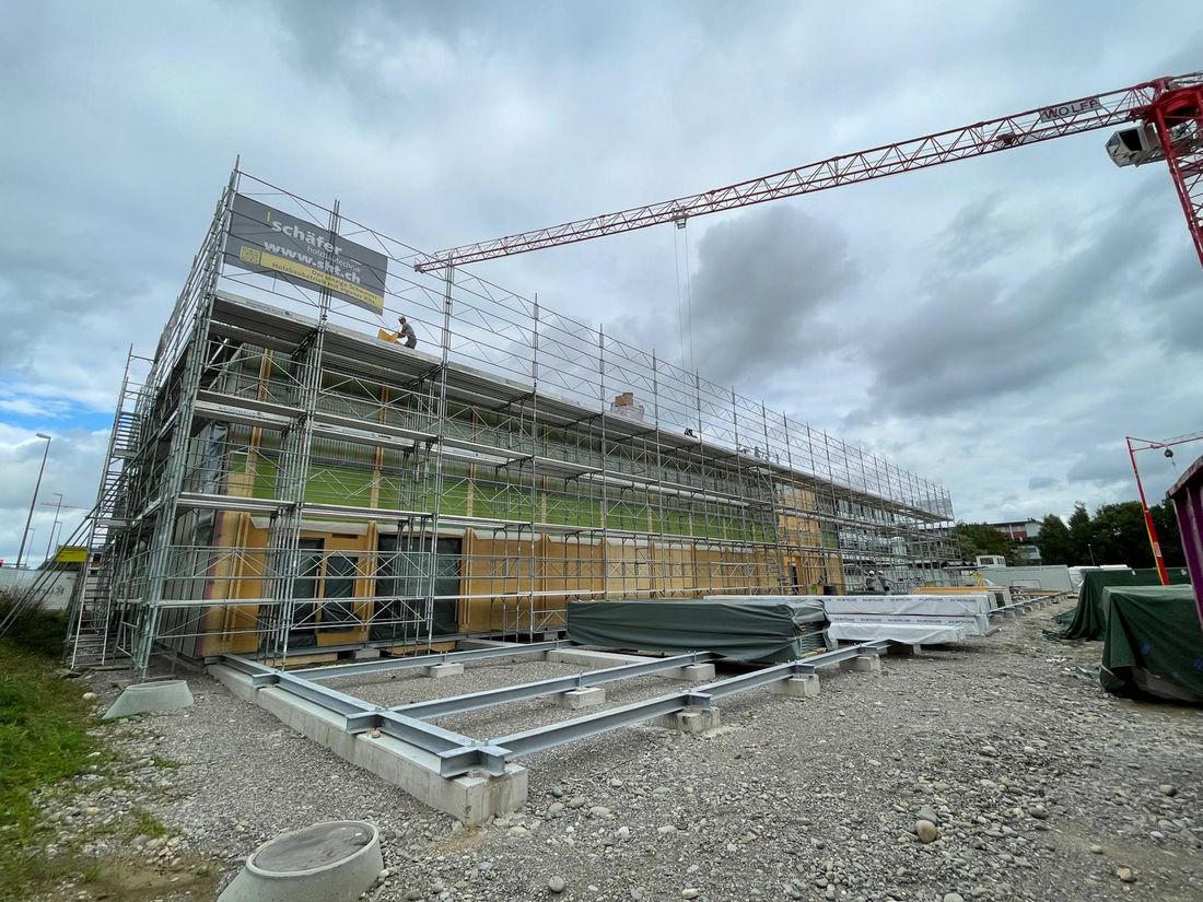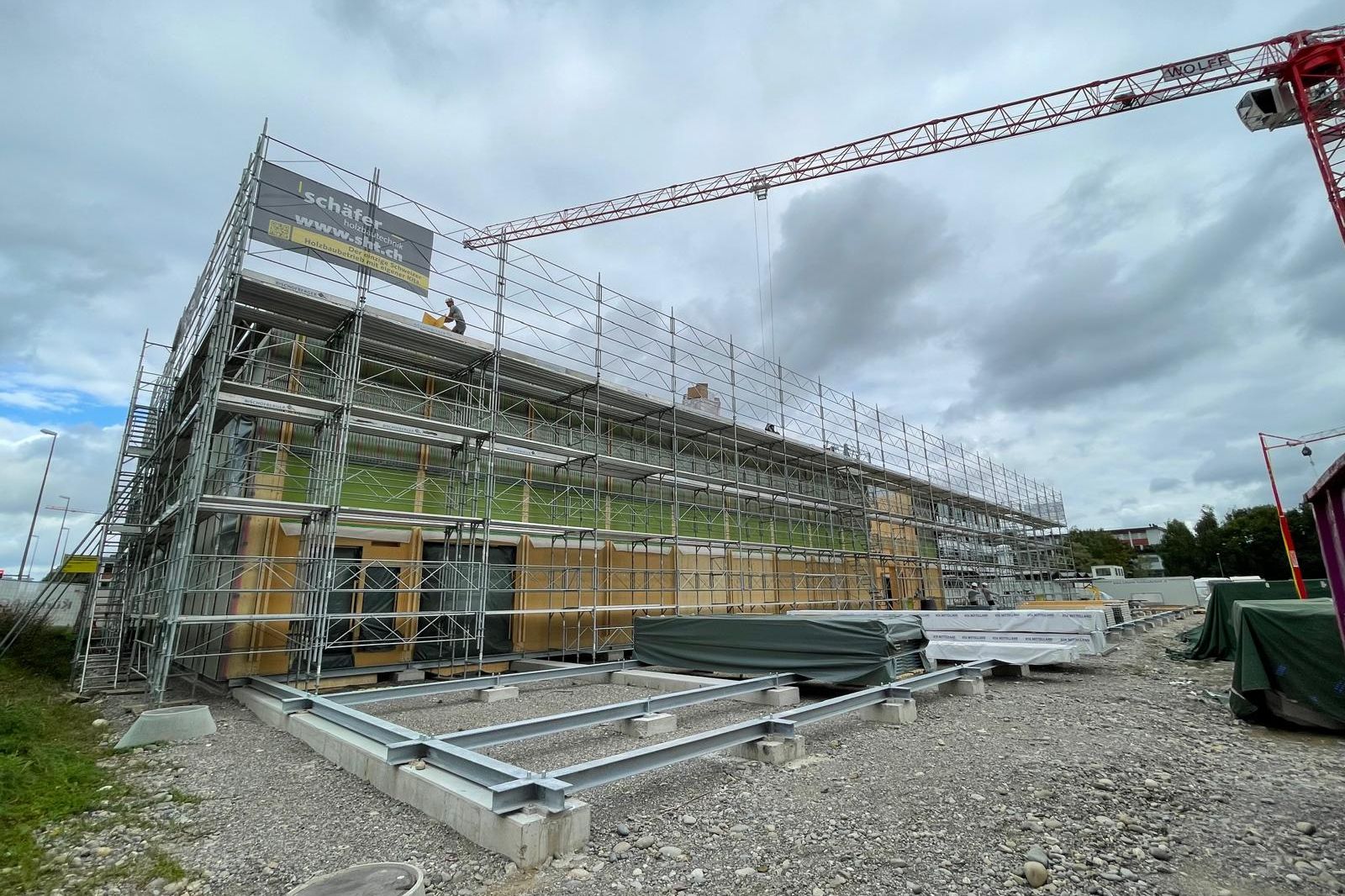 Zunächst wurde die Stahl-Unterkonstruktion auf die Betonfundamente gesetzt. Anschliessend folgten die Wände und Decke der ersten Halle. Momentan wird der Zwischenbau – das sogenannte Technikgeschoss – montiert.