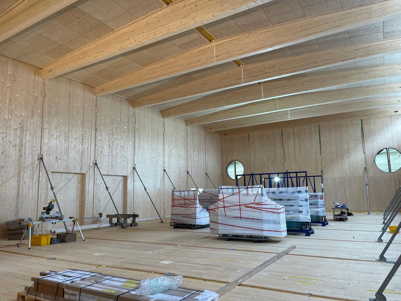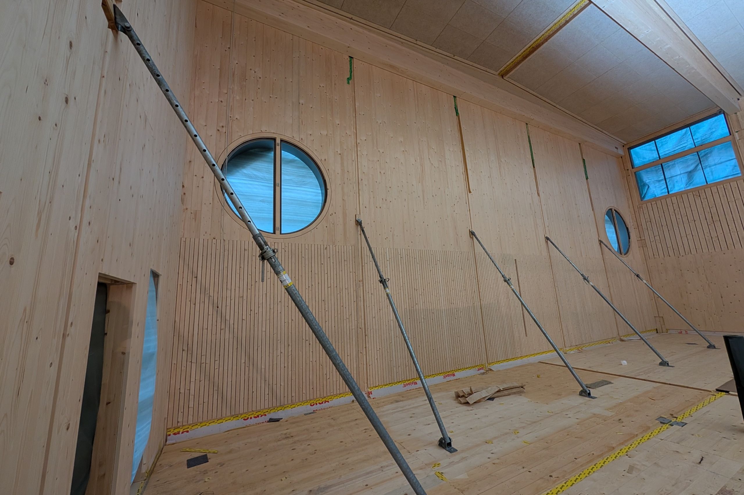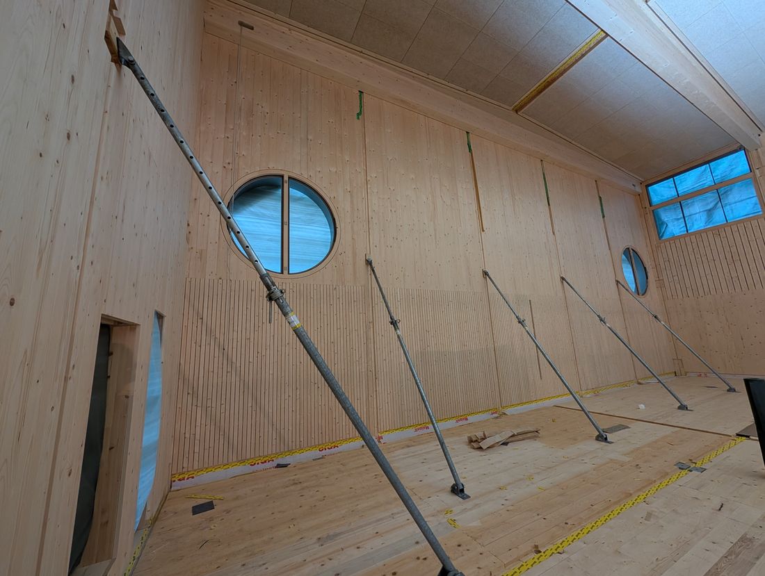 Schon bald können sich die Schüler:innen auf zwei grosszügige Sporthallen mit Boulderwand freuen. Das Design dieser wiederverwendbaren Turnhallen wurde übrigens schon mehrfach ausgezeichnet, z.B. mit dem Prix Lignum Gold National bei den Holzbauten oder auch mit dem Architekturpreis Kanton Zürich.