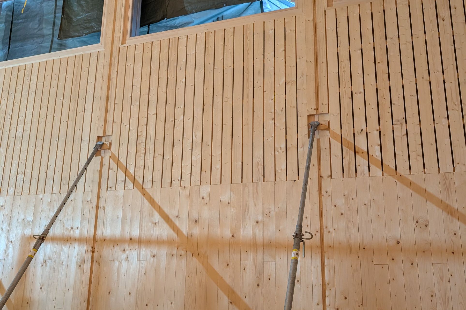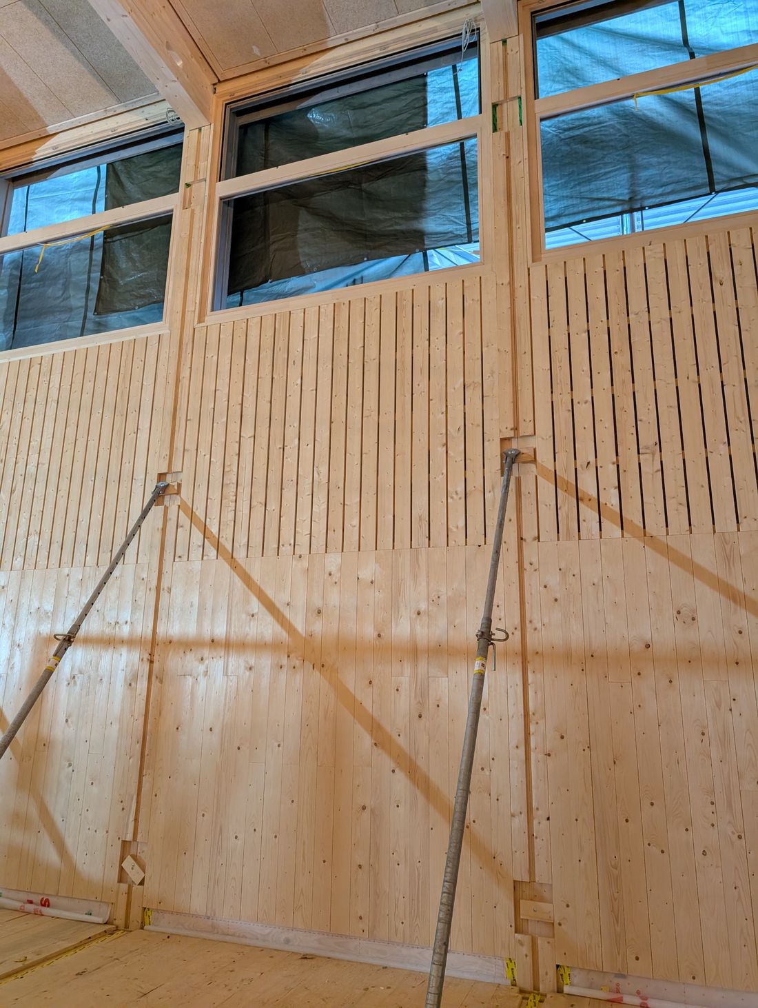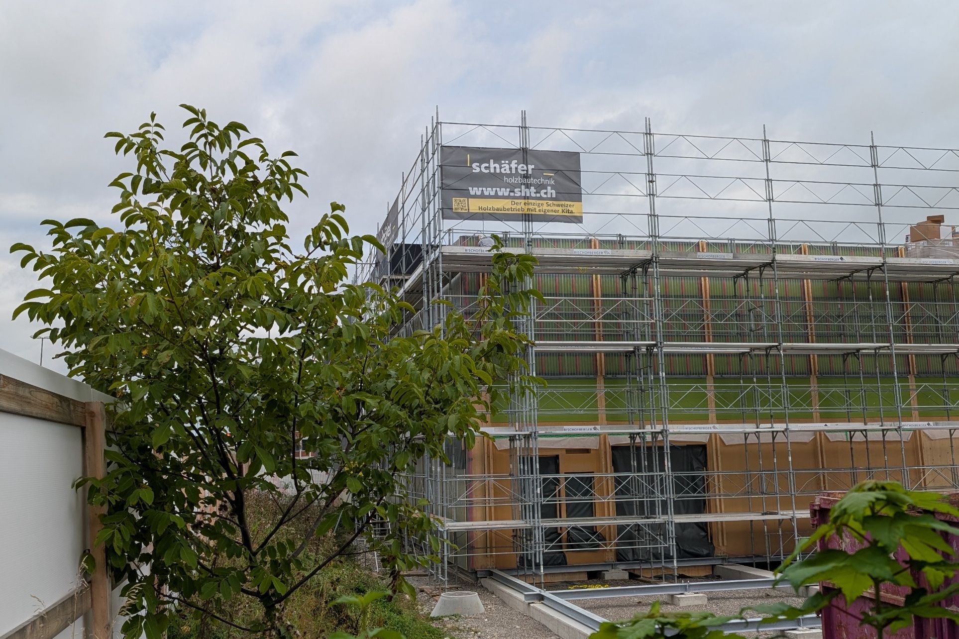Schon bald können sich die Schüler:innen auf zwei grosszügige Sporthallen mit Boulderwand freuen. Das Design dieser wiederverwendbaren Turnhallen wurde übrigens schon mehrfach ausgezeichnet, z.B. mit dem Prix Lignum Gold National bei den Holzbauten oder auch mit dem Architekturpreis Kanton Zürich.