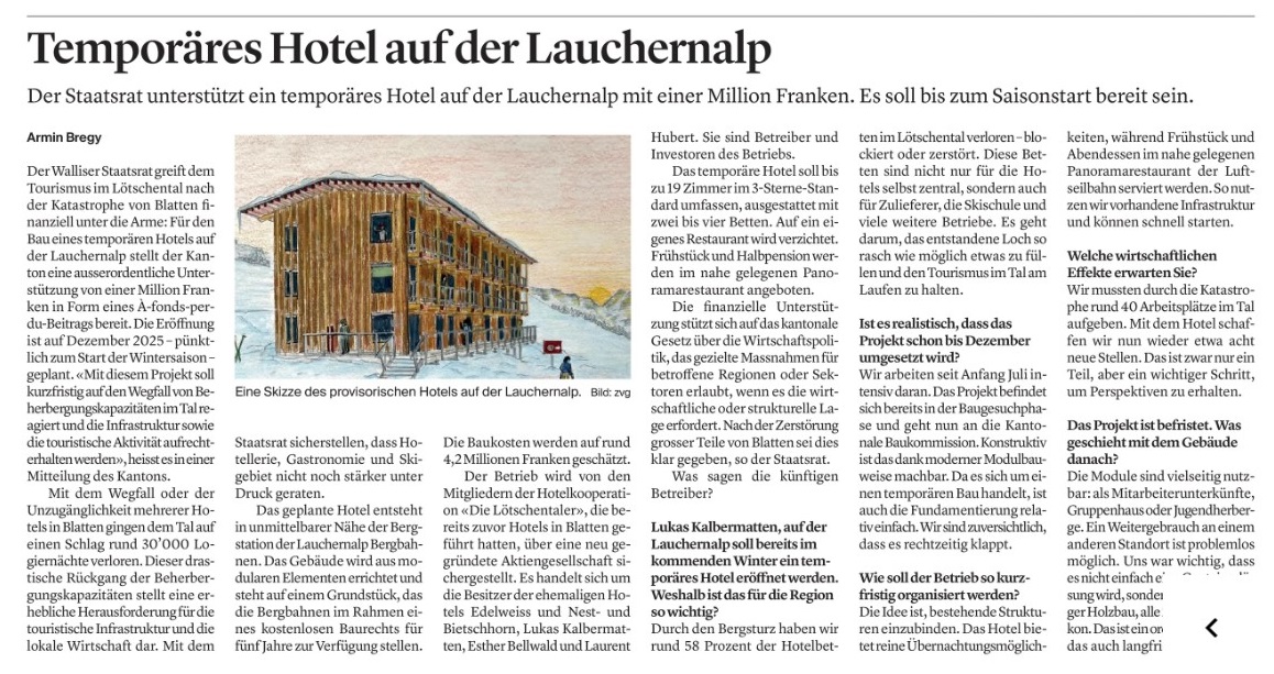 Mindestens fünf Jahre lang soll das Hotel auf der Lauchernalp stehen bleiben. Danach wird es abgebaut und kann in Blatten als Gruppenunterkunft, Mitarbeiterhaus für Hotelangestellte oder Jugendherberge wieder aufgebaut werden.