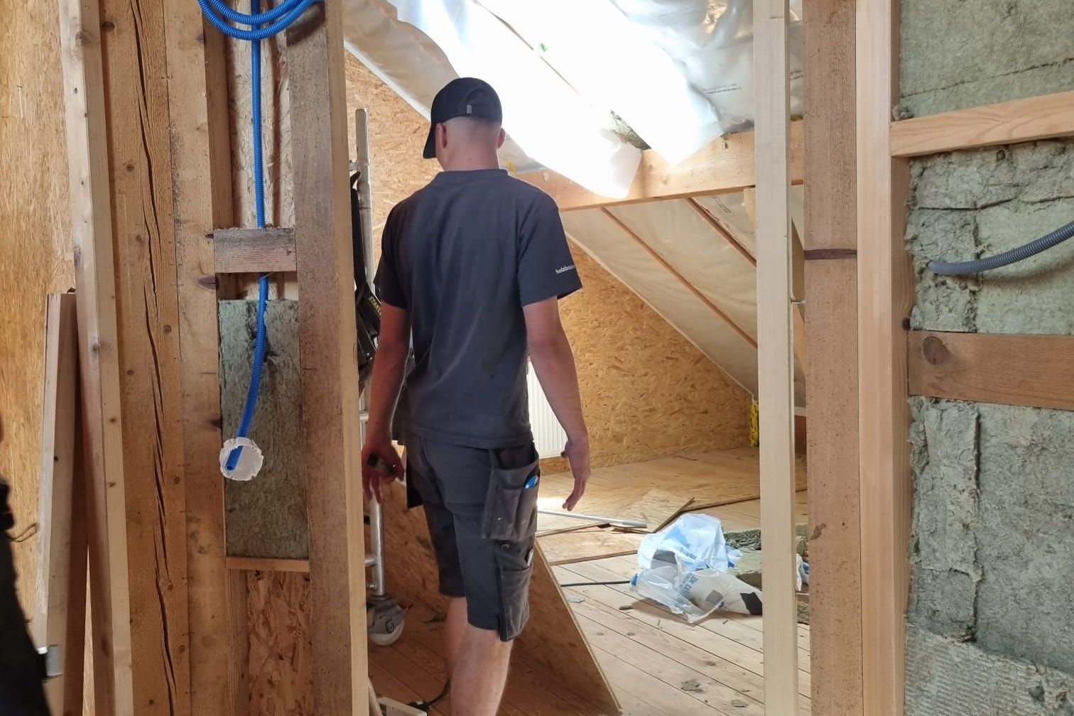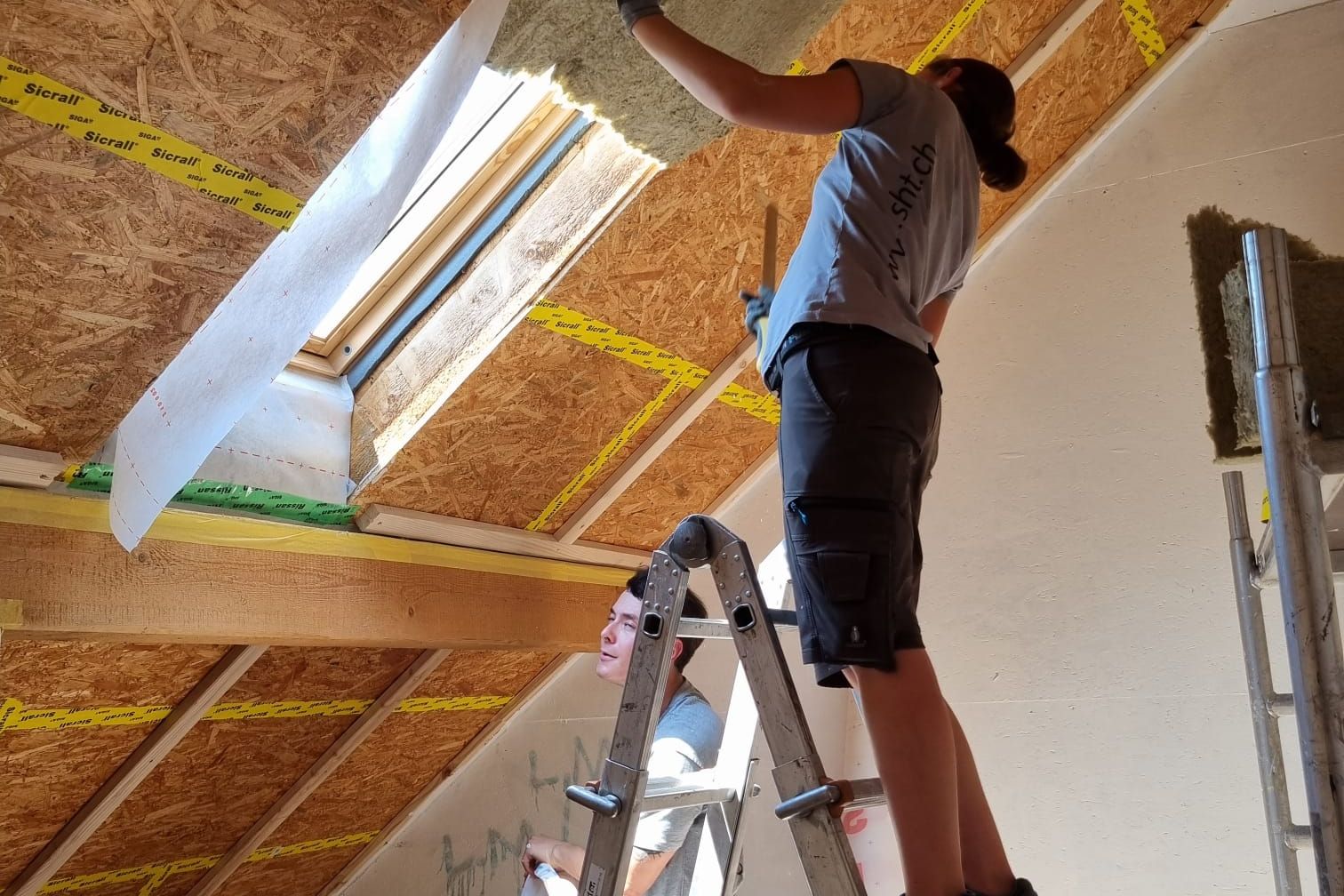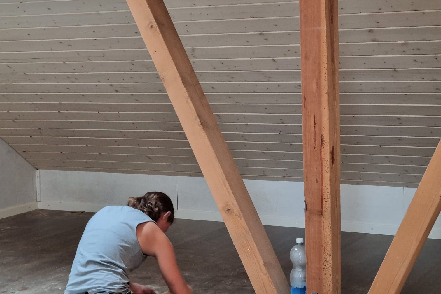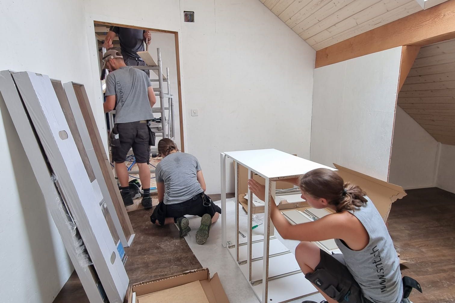 Nach 2021 (in Sisikon) und 2023 (im Hasliberg) waren wir in diesem Jahr im Oberaargau tätig. Eine Woche lang haben unsere zehn Lernenden und drei erfahrene Zimmermänner bei einer Bauernfamilie den zweiten Stock in ihrem Wohnhaus ausgebaut. Dort wohnen die Kinder und bislang waren die Wände, Böden und die Decke im Rohzustand, die Fenster ohne Futter. Die Zimmer waren karg und ungemütlich. In fünf Tagen wurde gestrichen, getäfert, Laminat verlegt, neue Türen und Fensterfutter montiert und erste Möbel zusammengesetzt und dekoriert.