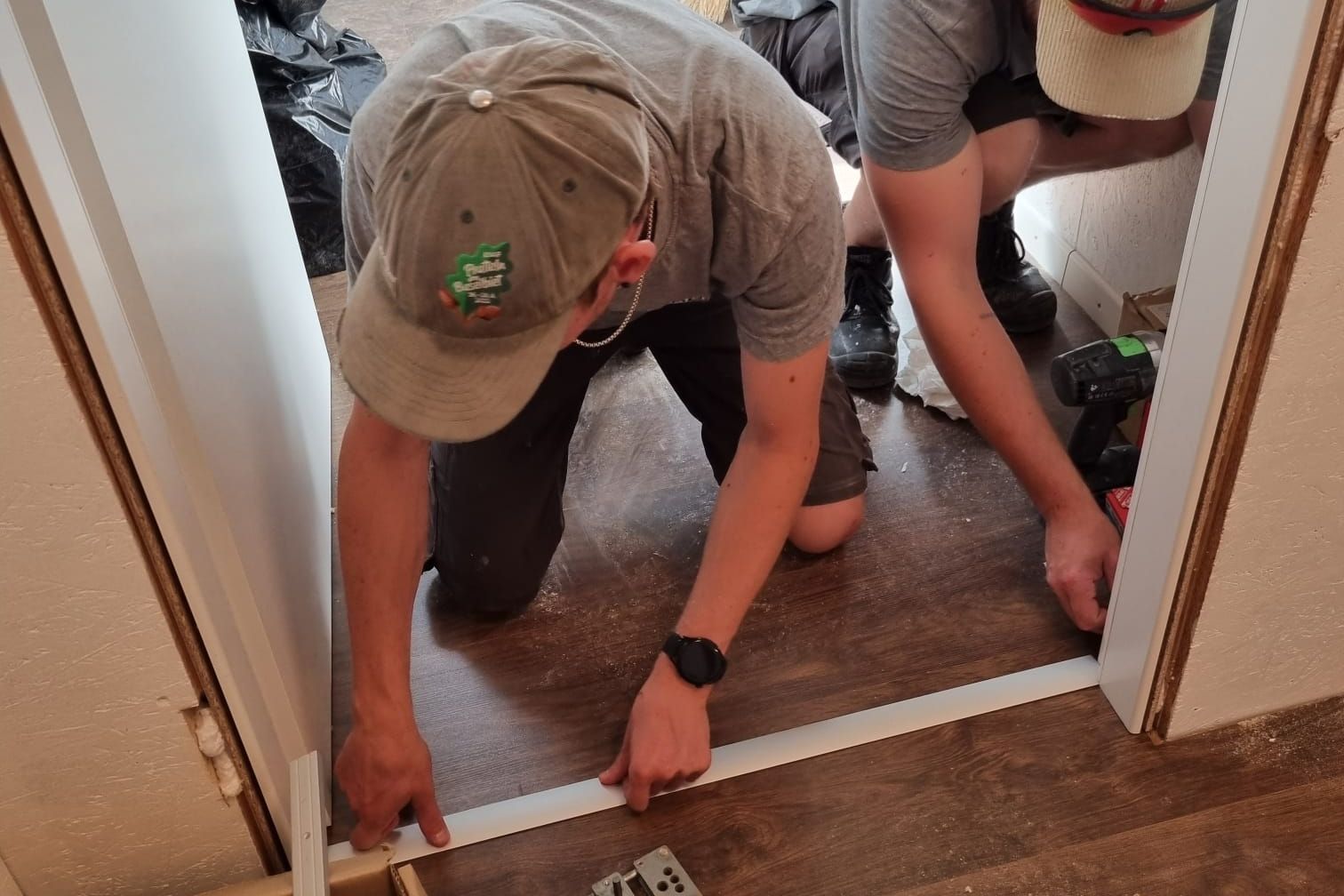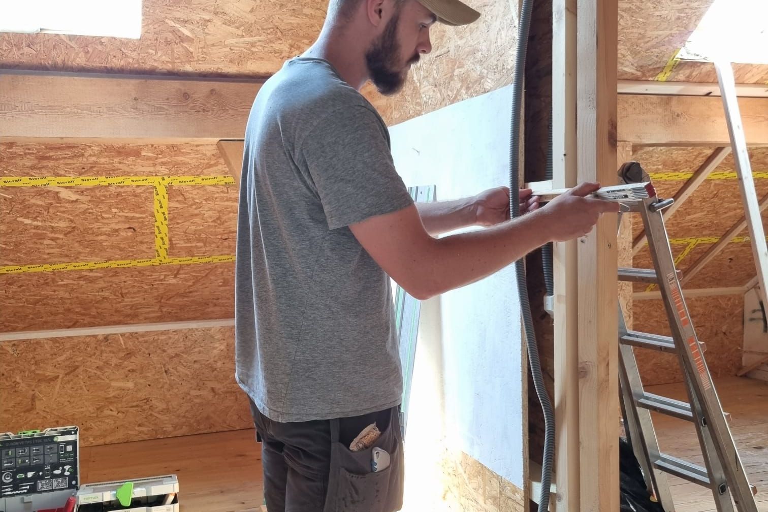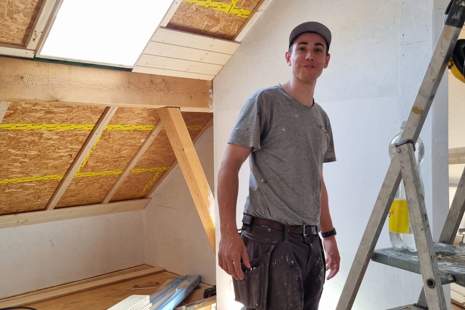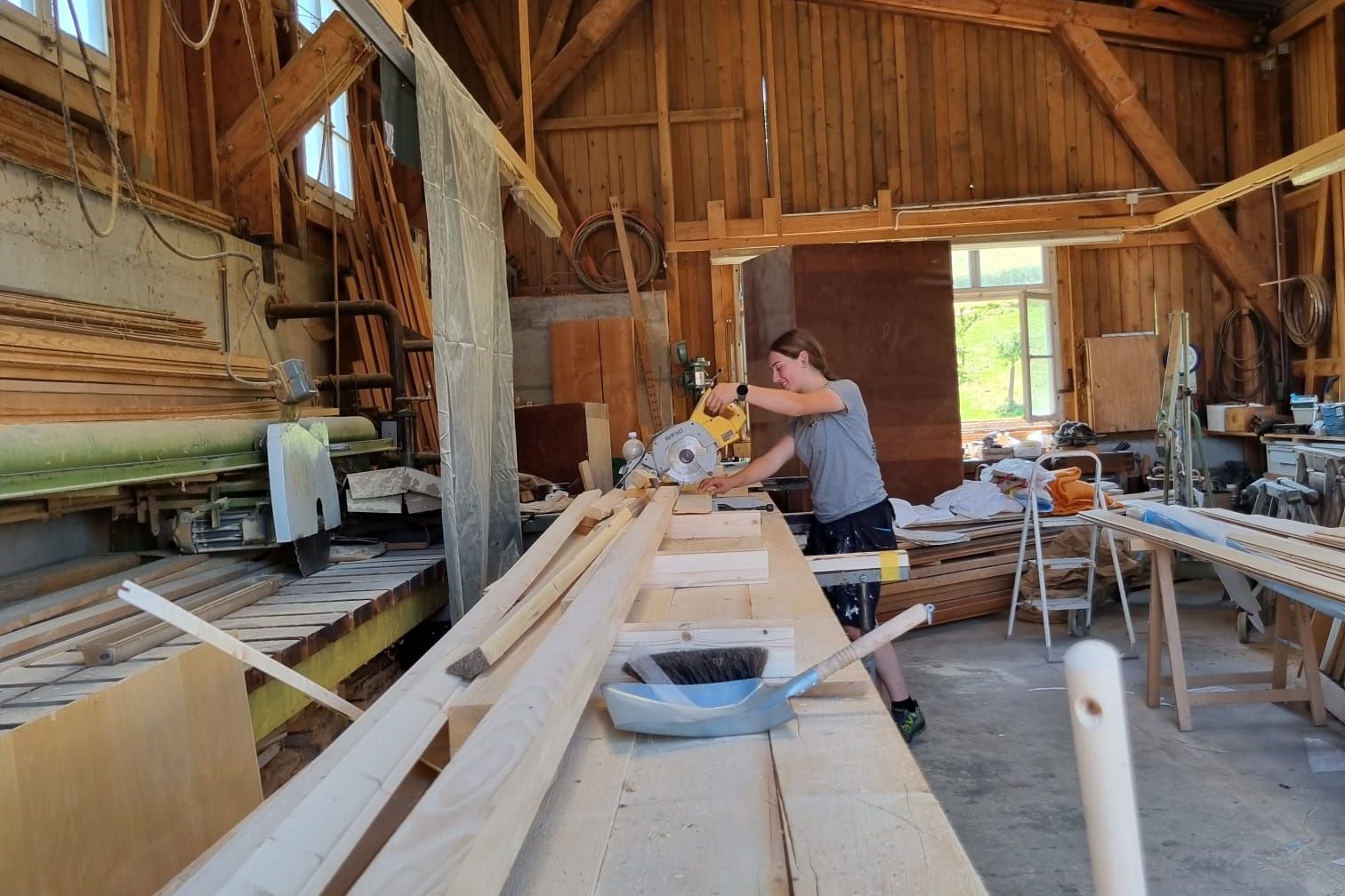 Nach 2021 (in Sisikon) und 2023 (im Hasliberg) waren wir in diesem Jahr im Oberaargau tätig. Eine Woche lang haben unsere zehn Lernenden und drei erfahrene Zimmermänner bei einer Bauernfamilie den zweiten Stock in ihrem Wohnhaus ausgebaut. Dort wohnen die Kinder und bislang waren die Wände, Böden und die Decke im Rohzustand, die Fenster ohne Futter. Die Zimmer waren karg und ungemütlich. In fünf Tagen wurde gestrichen, getäfert, Laminat verlegt, neue Türen und Fensterfutter montiert und erste Möbel zusammengesetzt und dekoriert.