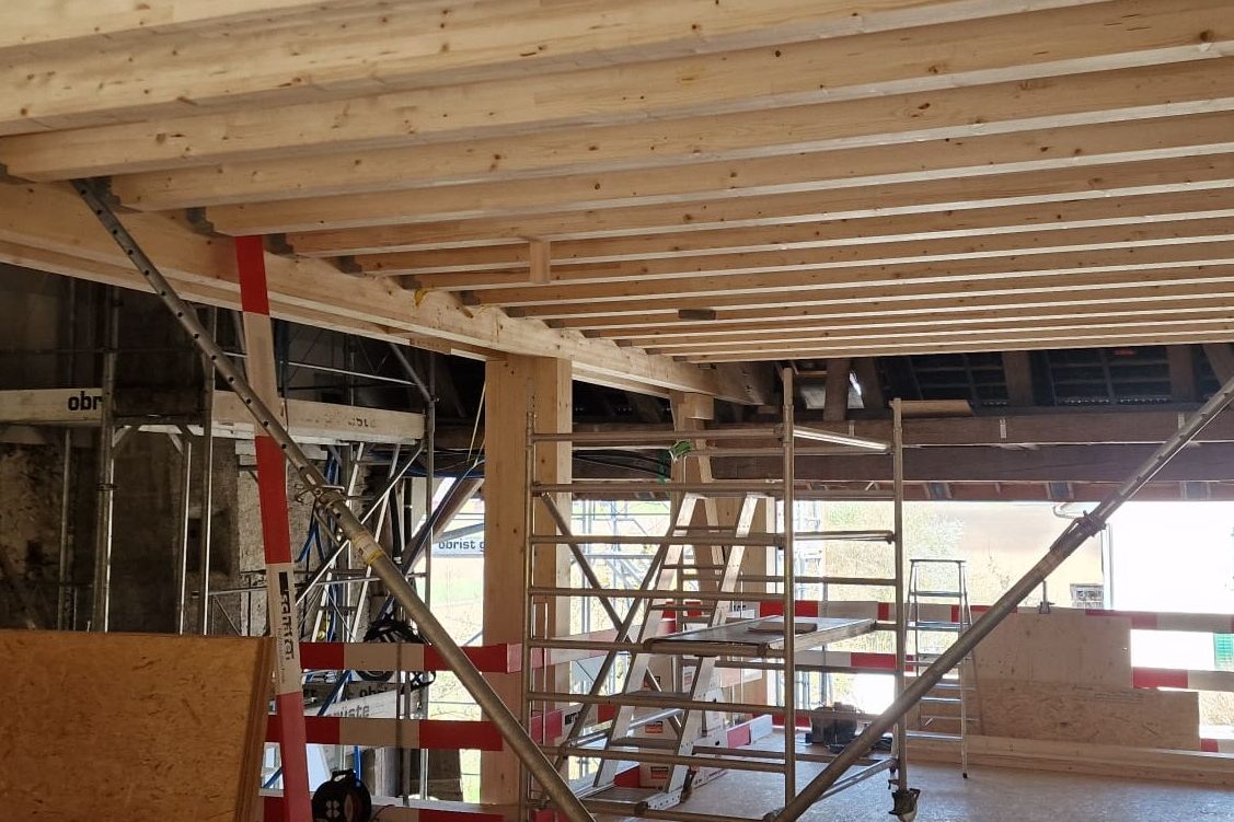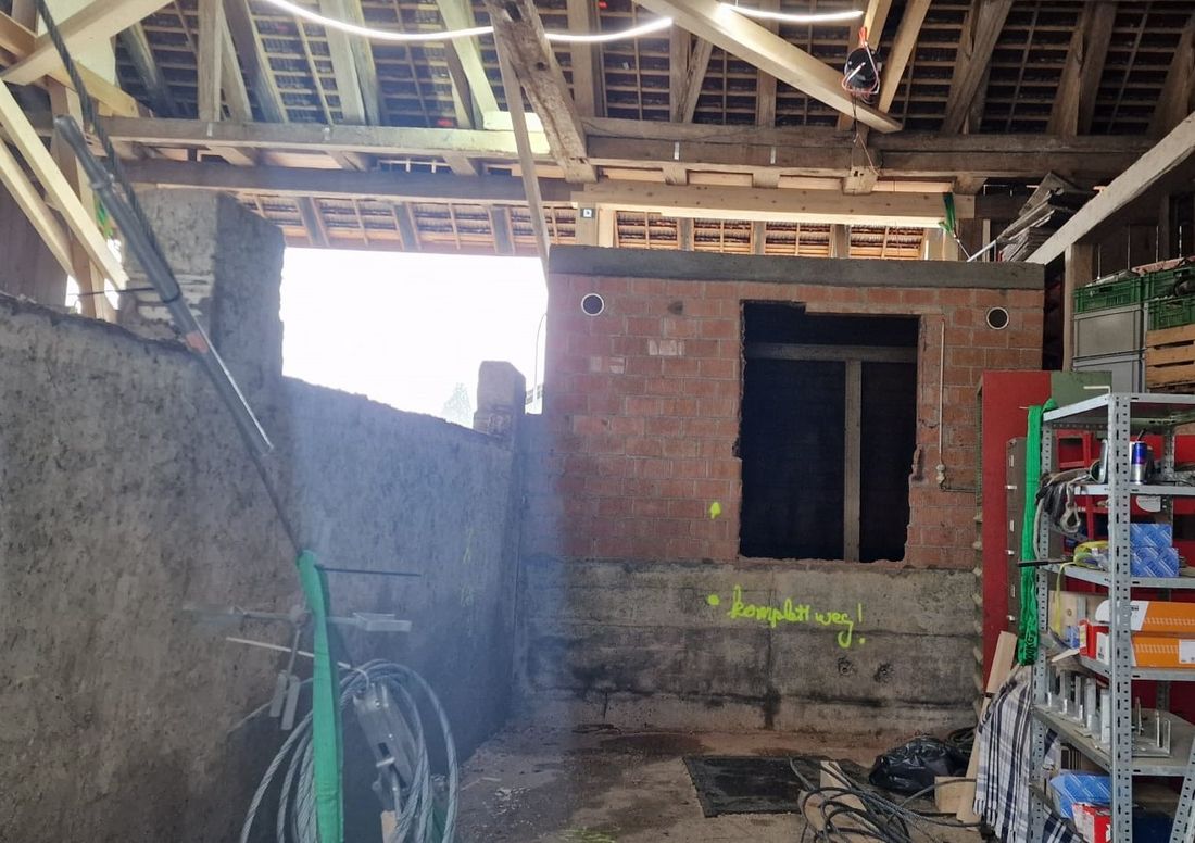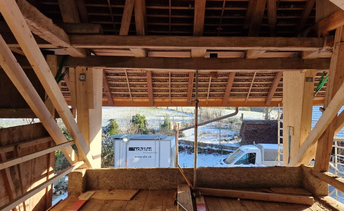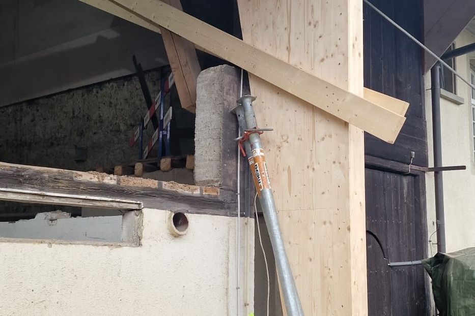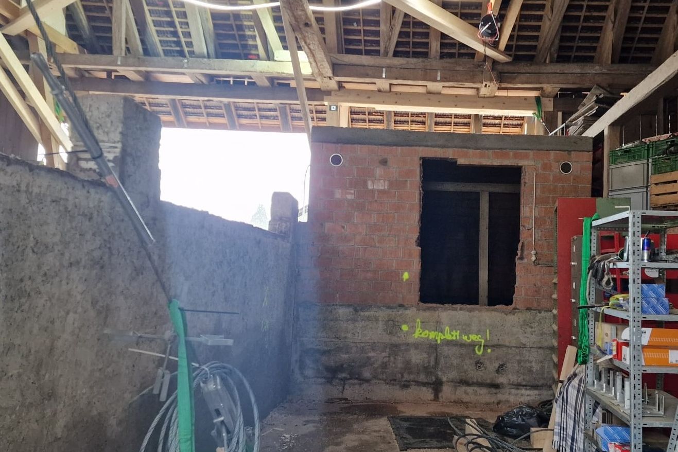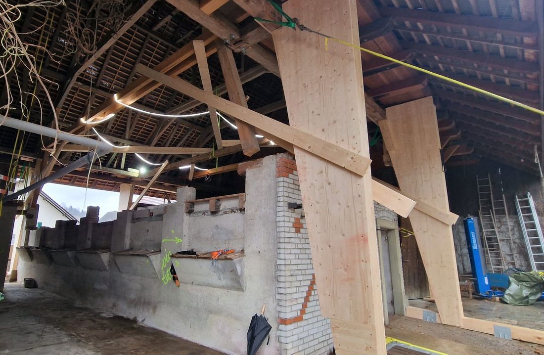 Bevor es richtig losging, mussten wir den bestehenden Dachstuhl provisorisch abstützen. Anfangs 2026 war der Baumeister vor Ort und riss die alten Wände und die Bodenplatten heraus und betonierte danach die neuen. Nun geht es weiter im Inneren mit den neuen Decken und Wänden.