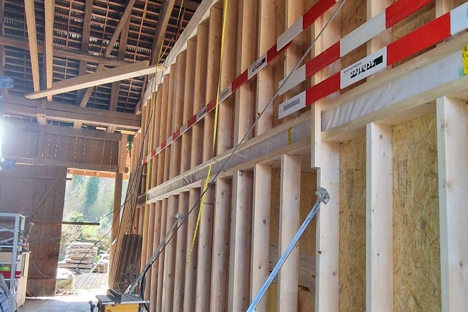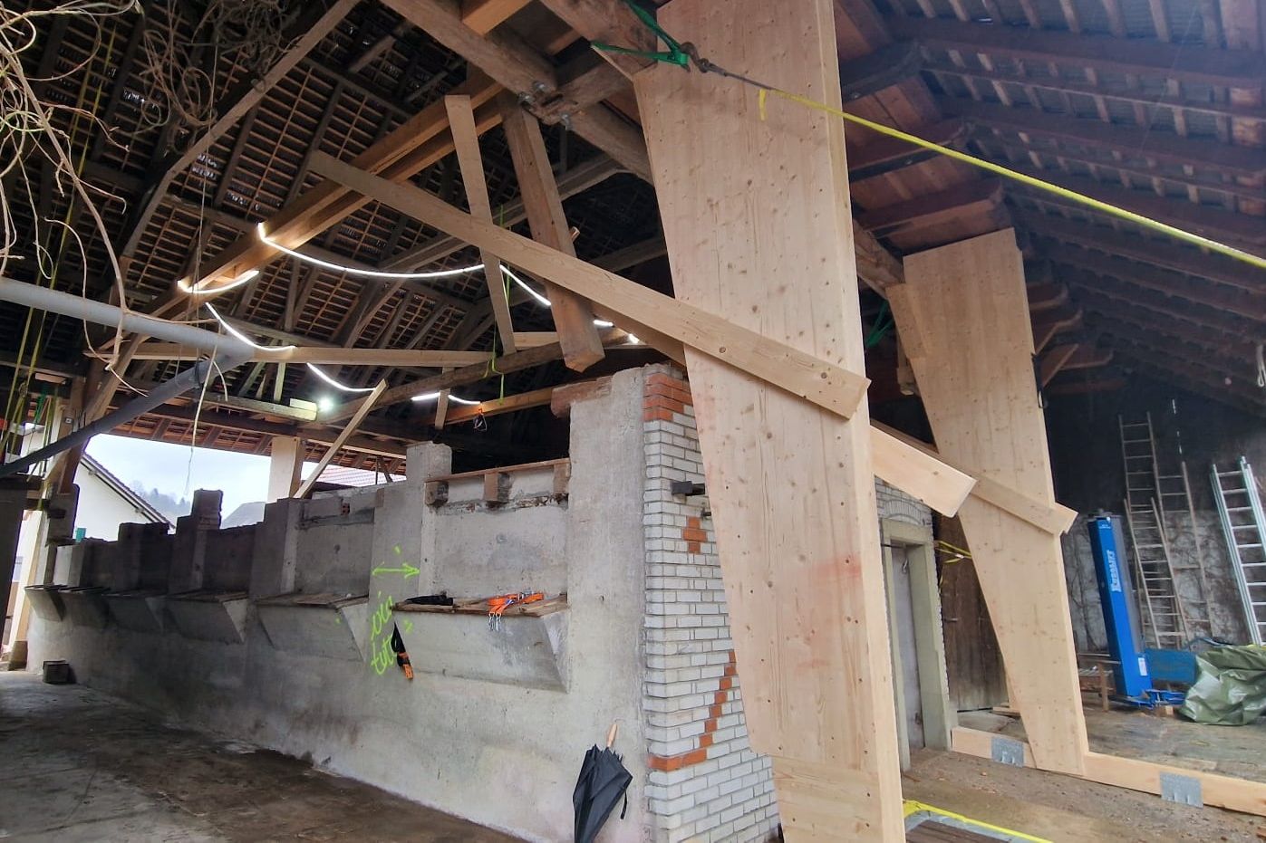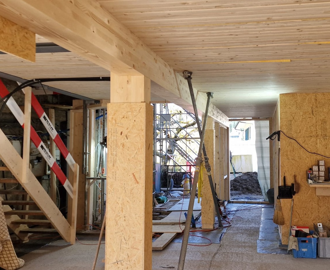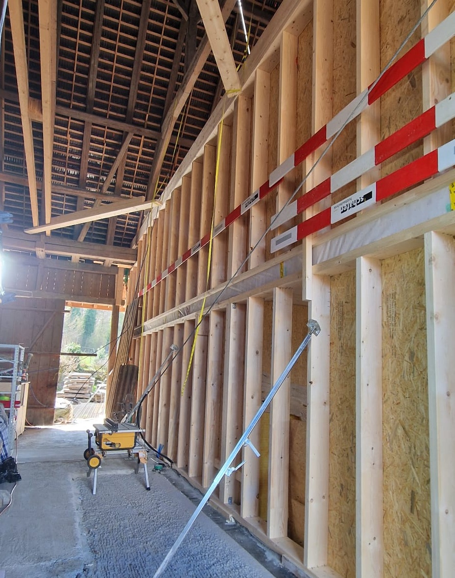 Bevor es richtig losging, mussten wir den bestehenden Dachstuhl provisorisch abstützen. Anfangs 2026 war der Baumeister vor Ort und riss die alten Wände und die Bodenplatten heraus und betonierte danach die neuen. Nun geht es weiter im Inneren mit den neuen Decken und Wänden.