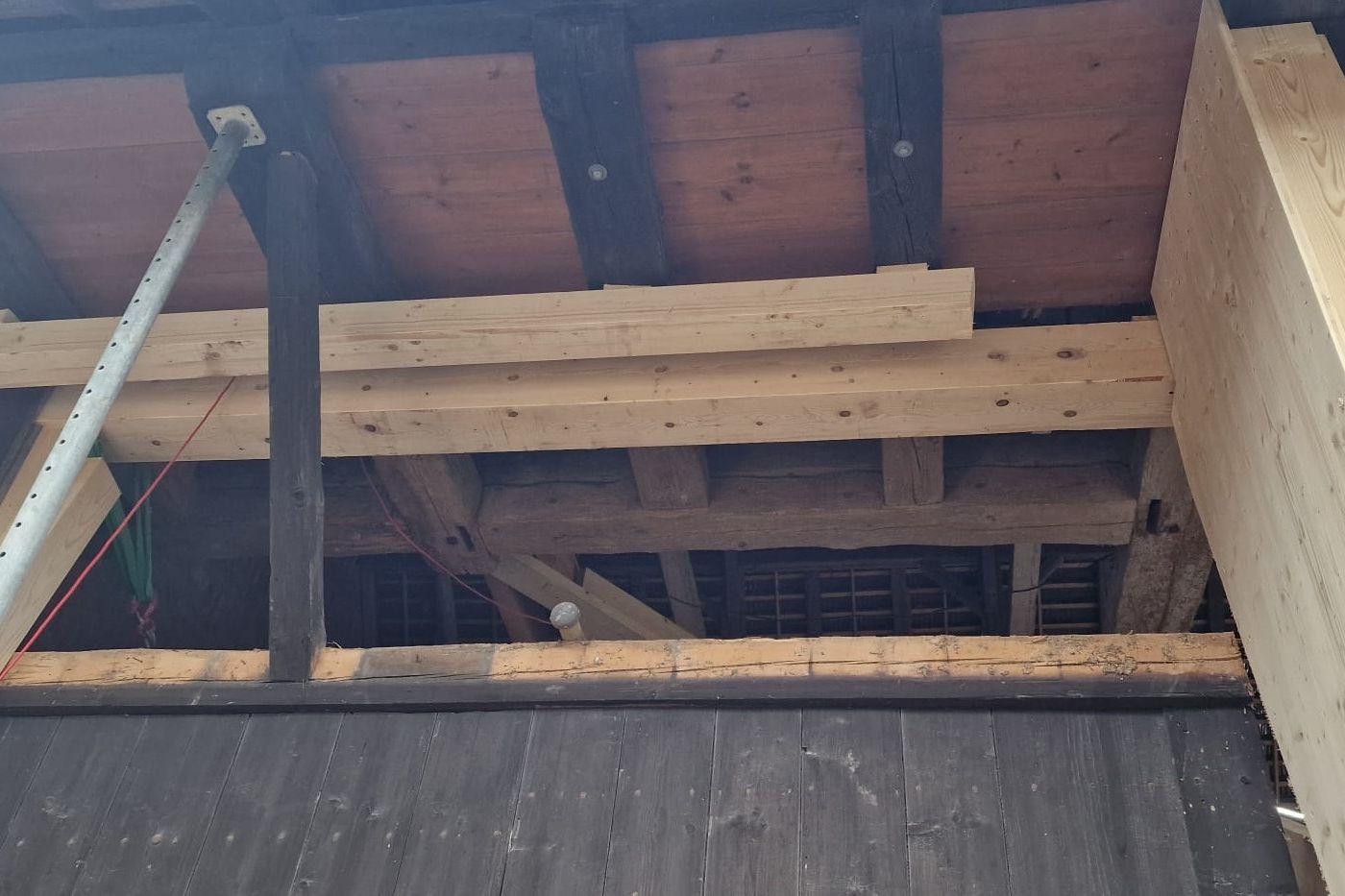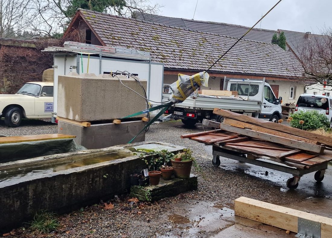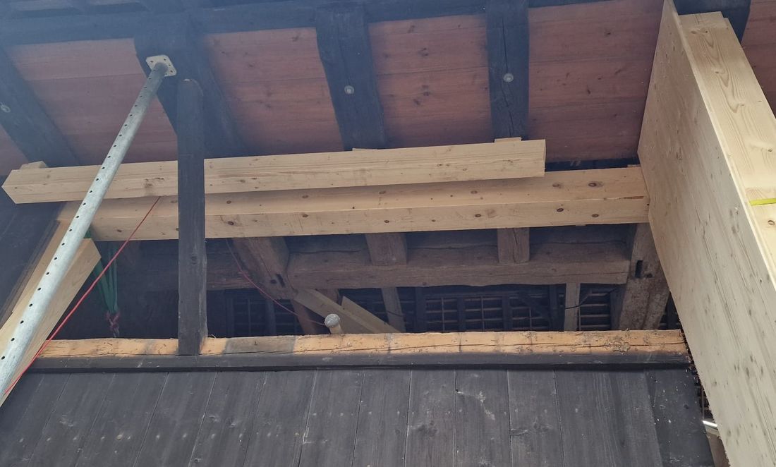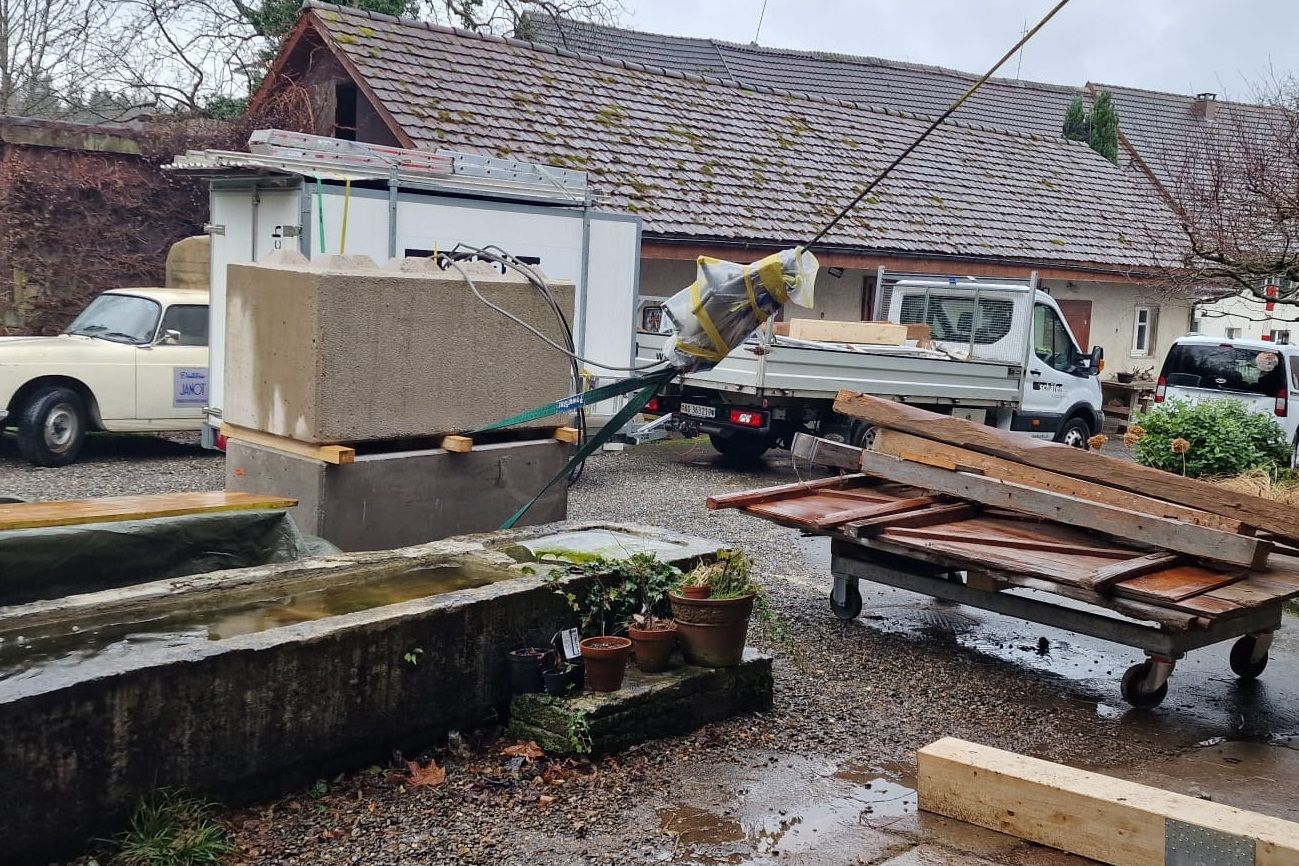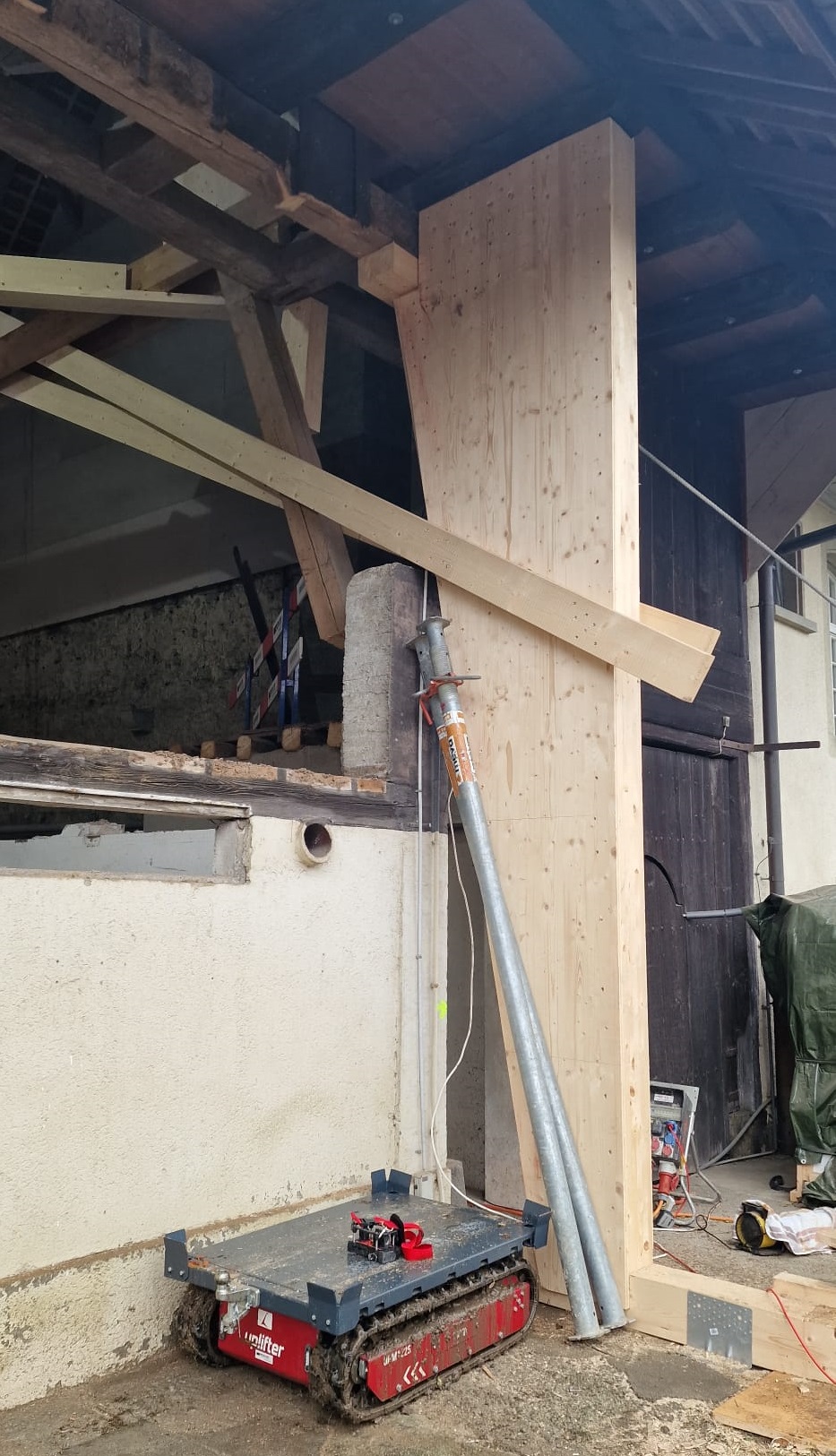 Bevor es richtig losging, mussten wir den bestehenden Dachstuhl provisorisch abstützen. Anfangs 2026 war der Baumeister vor Ort und riss die alten Wände und die Bodenplatten heraus und betonierte danach die neuen. Nun geht es weiter im Inneren mit den neuen Decken und Wänden.