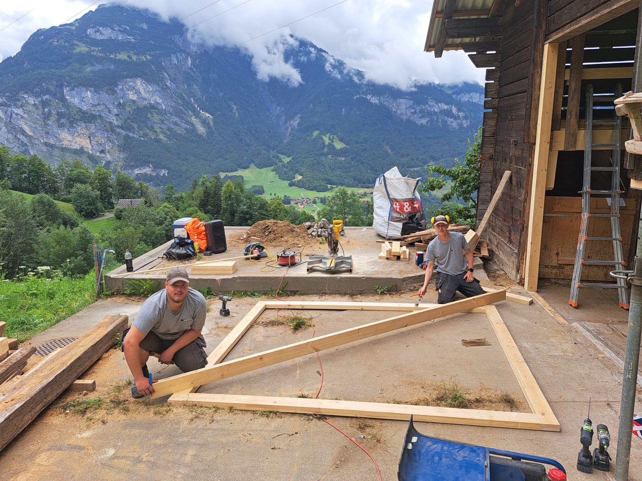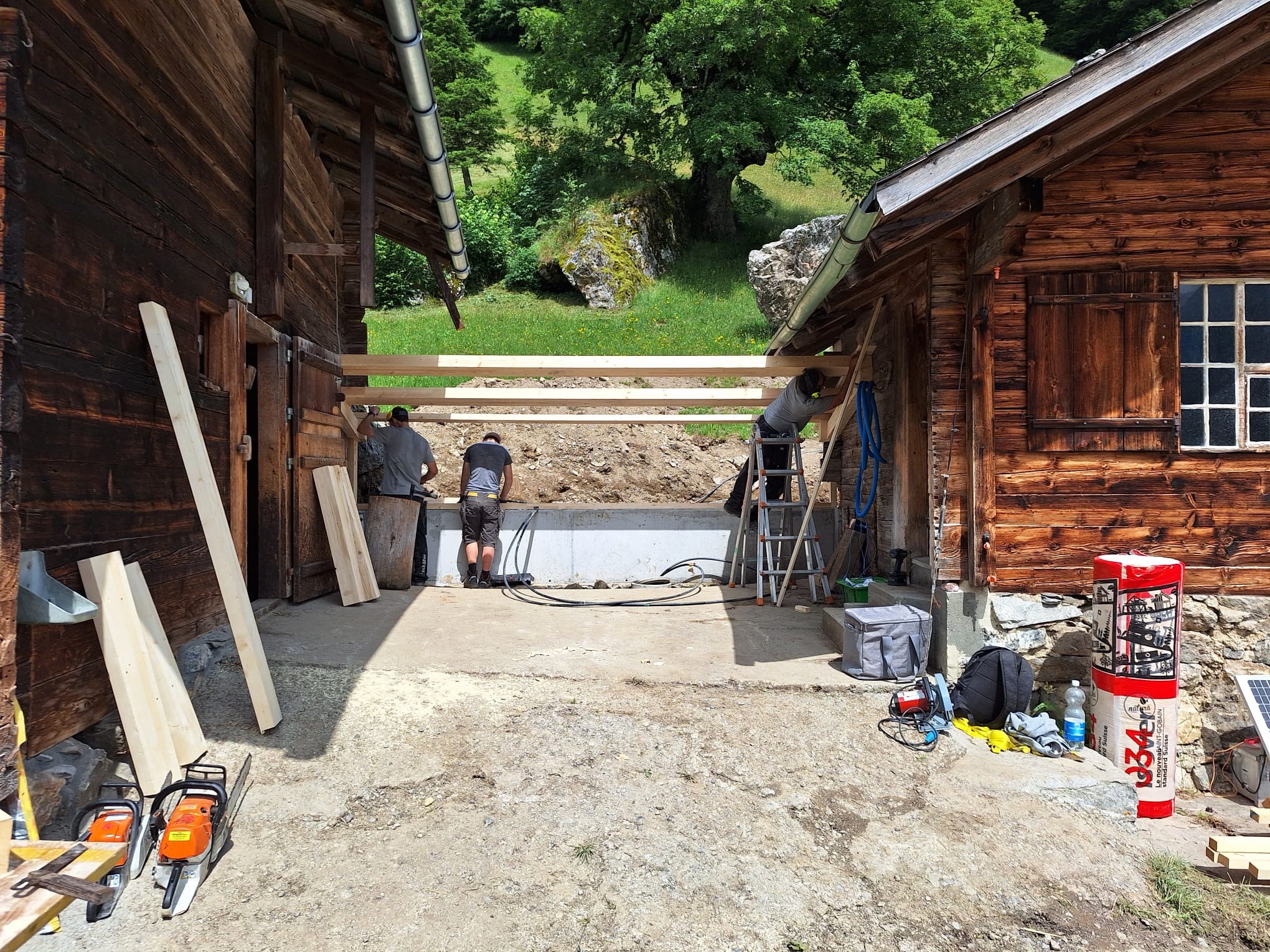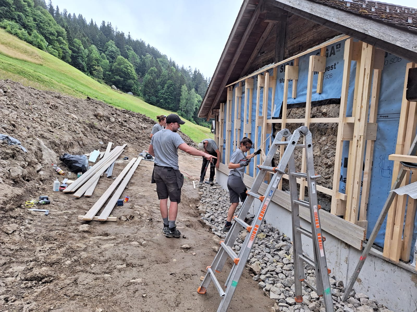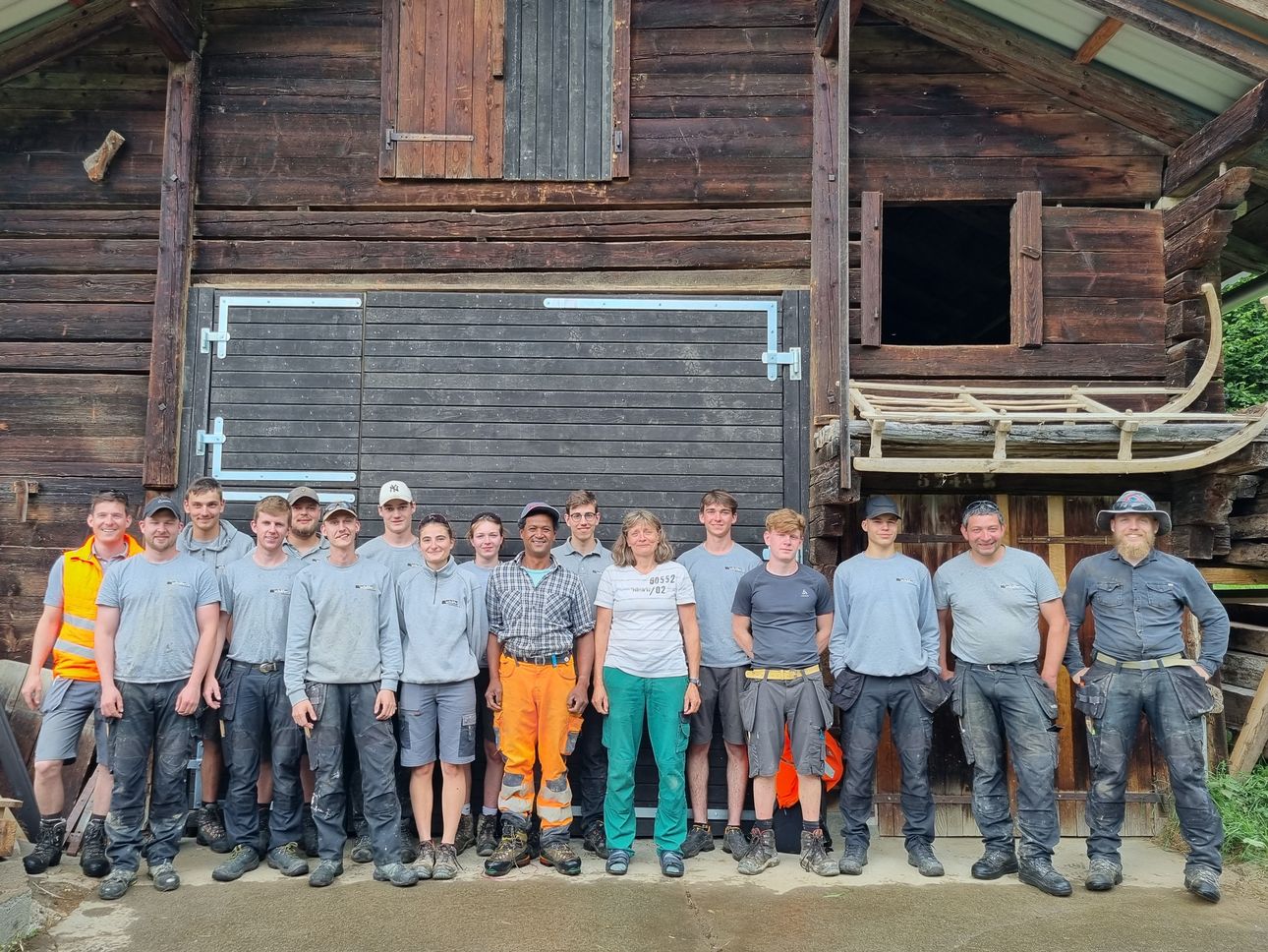 Auf drei verschiedenen Baustellen waren unsere 12 Lernenden unentgeltlich tätig für eine Bauernfamilie. Eine alte Scheune bekam ein neues Tor und einen Zwischenboden, damit sie als Garage genutzt werden kann. Ein Silo bei einem Stall wurde verkleinert und ein neues Dach montiert und eine Alphütte wurde saniert: morsche Balken und Schindeln wurden ersetzt und die Viehtränke bekam eine neue Abdeckung.