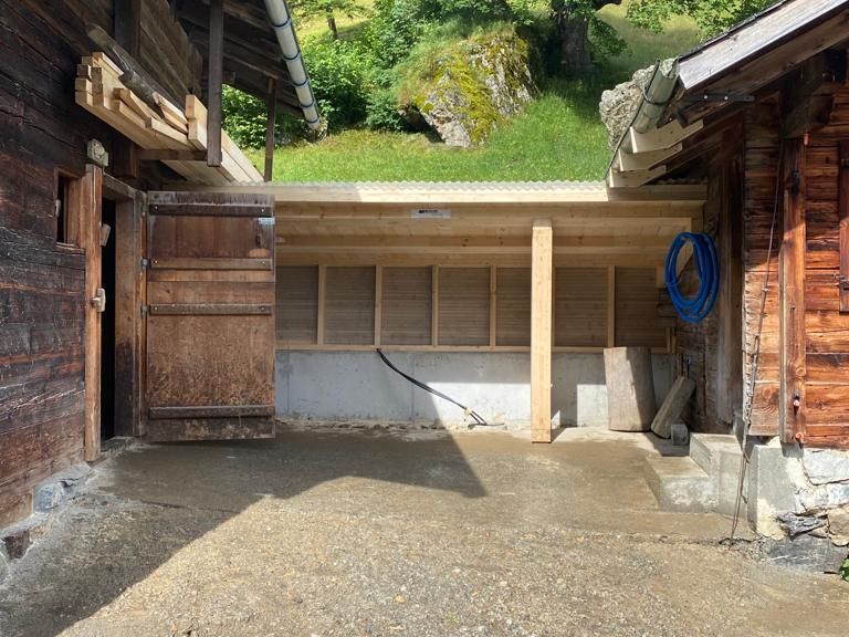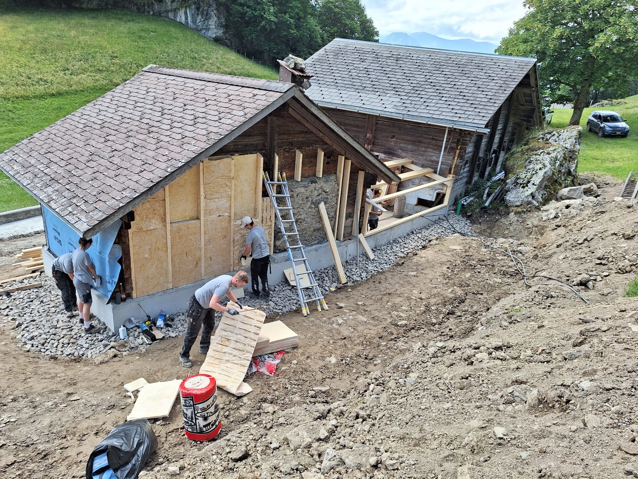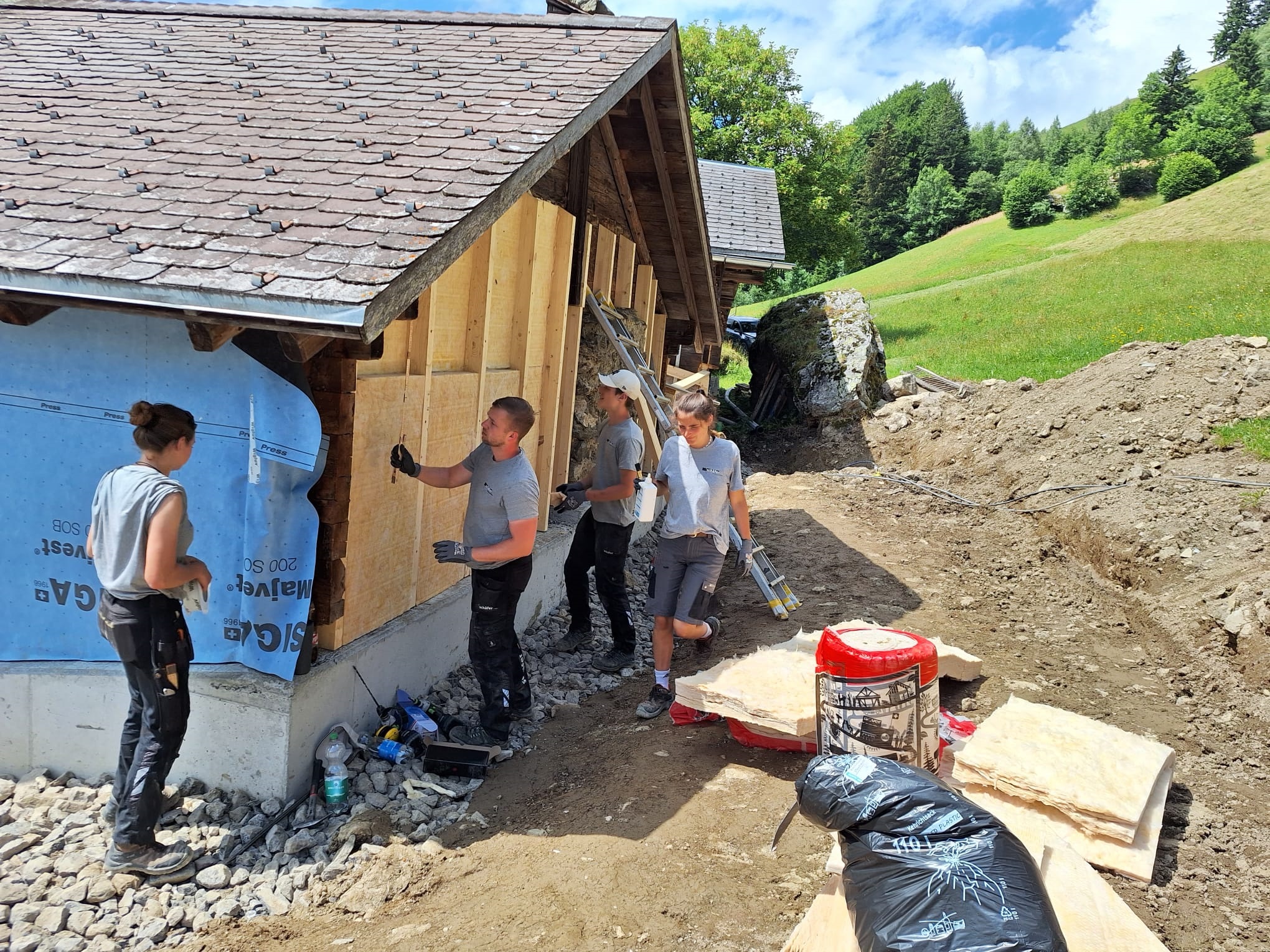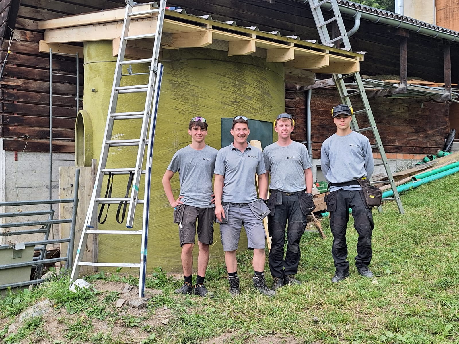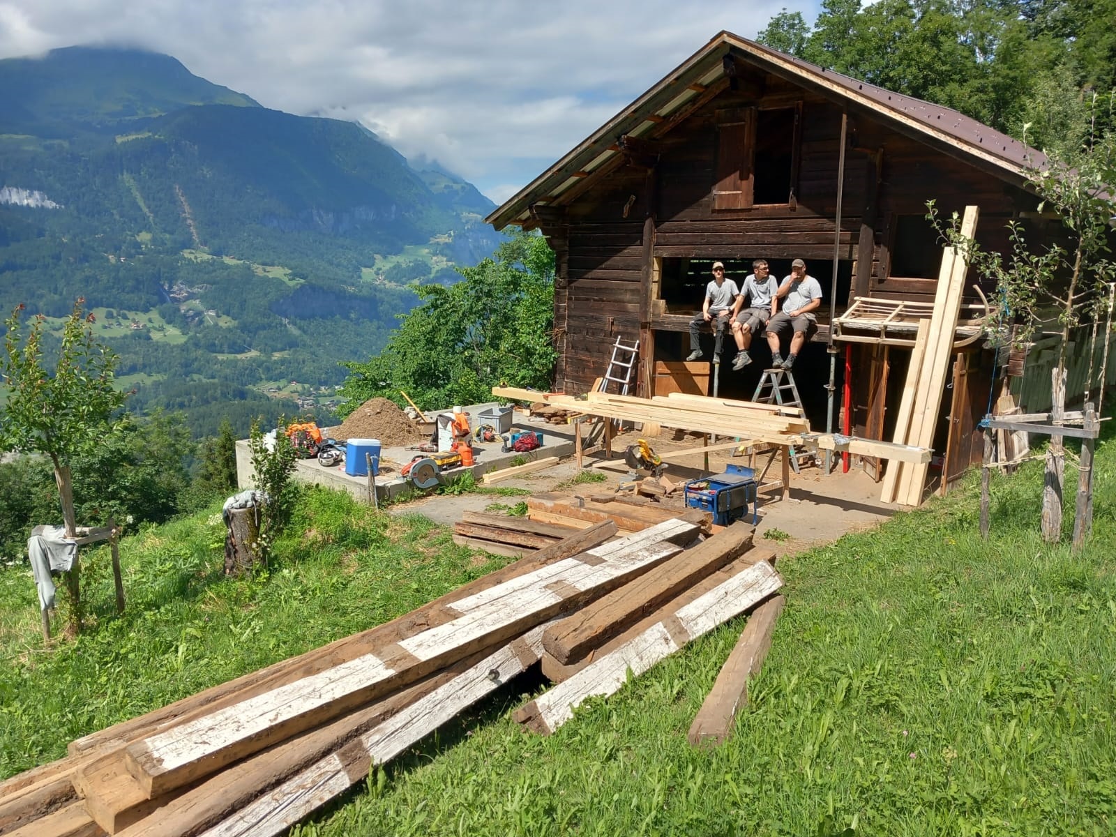 Auf drei verschiedenen Baustellen waren unsere 12 Lernenden unentgeltlich tätig für eine Bauernfamilie. Eine alte Scheune bekam ein neues Tor und einen Zwischenboden, damit sie als Garage genutzt werden kann. Ein Silo bei einem Stall wurde verkleinert und ein neues Dach montiert und eine Alphütte wurde saniert: morsche Balken und Schindeln wurden ersetzt und die Viehtränke bekam eine neue Abdeckung.