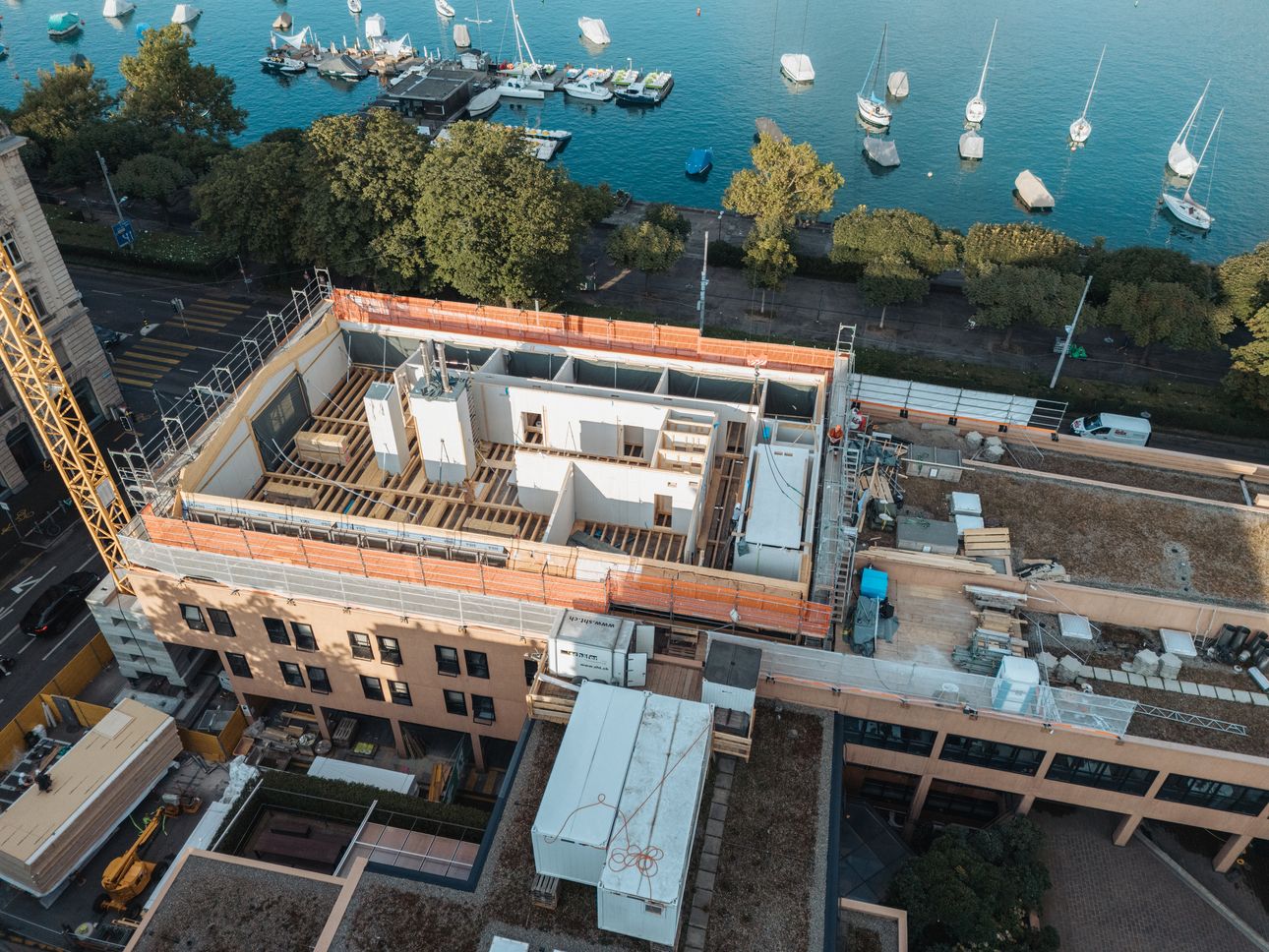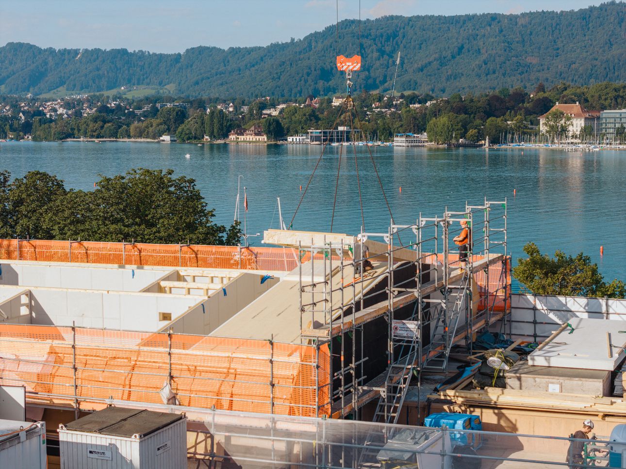 Im April 2024 starteten unsere Zimmerleute mit der Produktion der Elemente in unserer Halle in Dottikon und Ende Juli begann die Montage vor Ort in Zürich. Während unten beim Seeufer entlang und auf dem Sächsilüte-Platz die Streetparade tobte oder die Rad-WM stattfand, wurde oben fleissig gehämmert, ausgemessen und montiert.