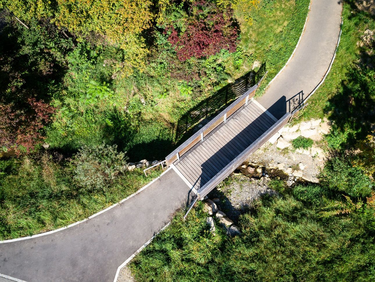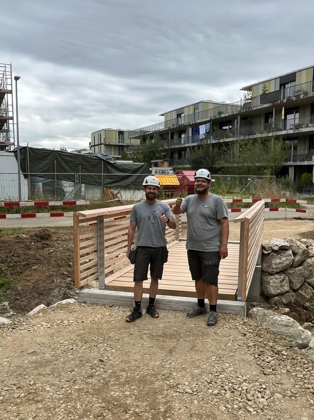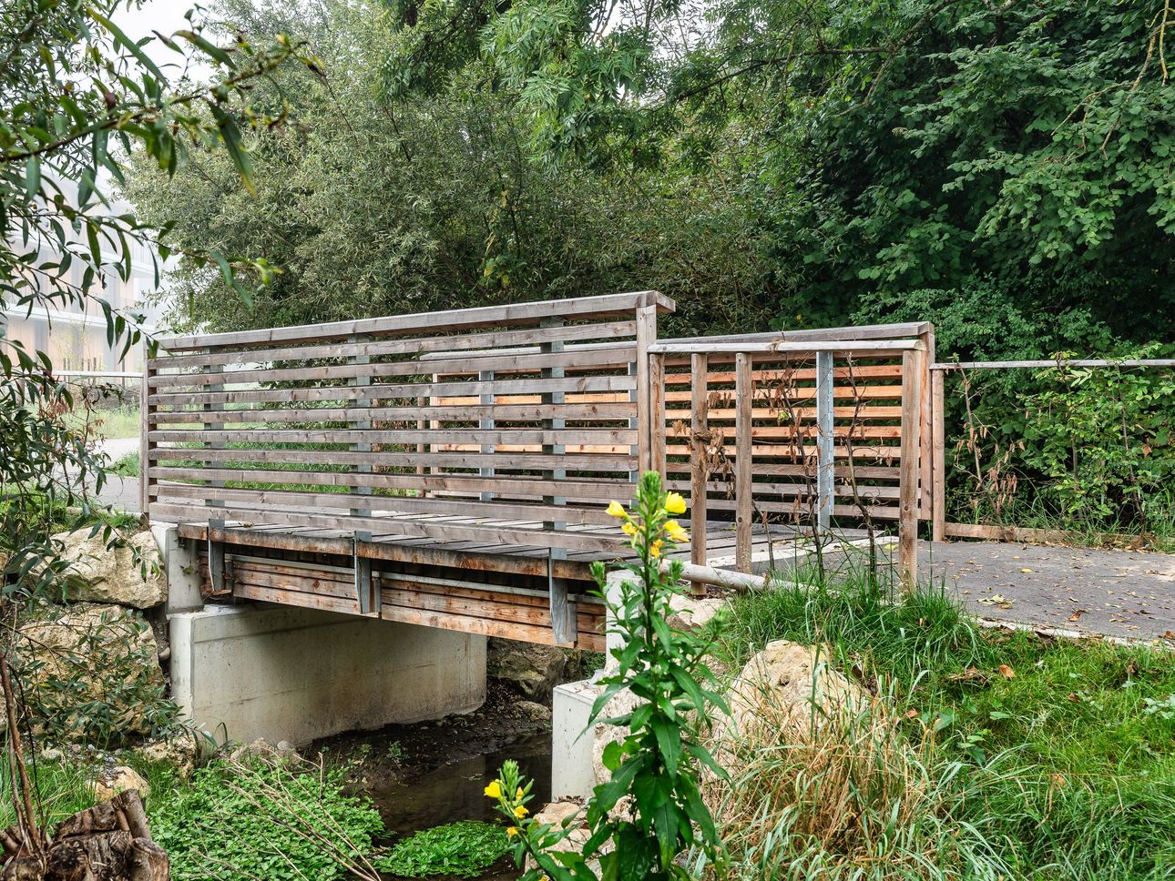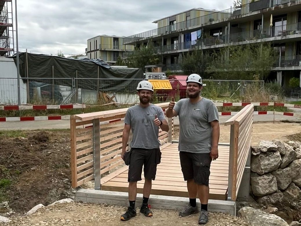 Gleich zwei Fussgängerbrücken aus Schweizer Holz durften wir 2024 über das Rombachbächli bauen. Ein Bericht zum Hochwasserschutz des Baches hatte ergeben, dass die bestehenden Brücken eine zu geringe Durchflusskapazität aufwiesen und deshalb ersetzt werden mussten. Jetzt kann das Rombachbächli an zwei Stellen wieder sicher und bequem überquert werden.