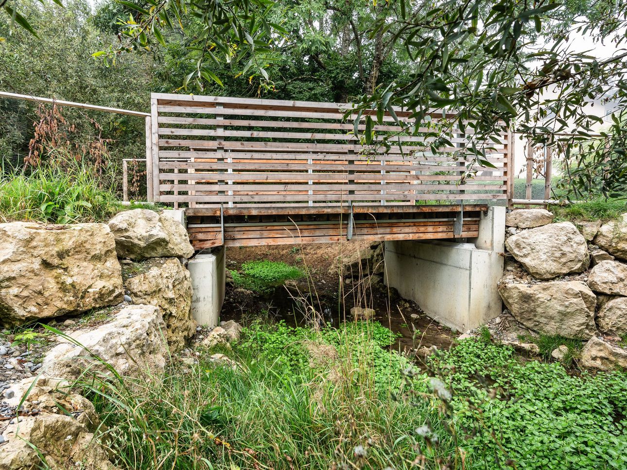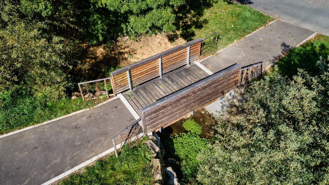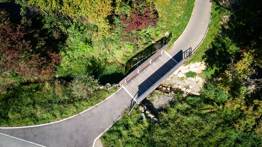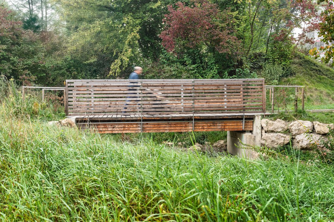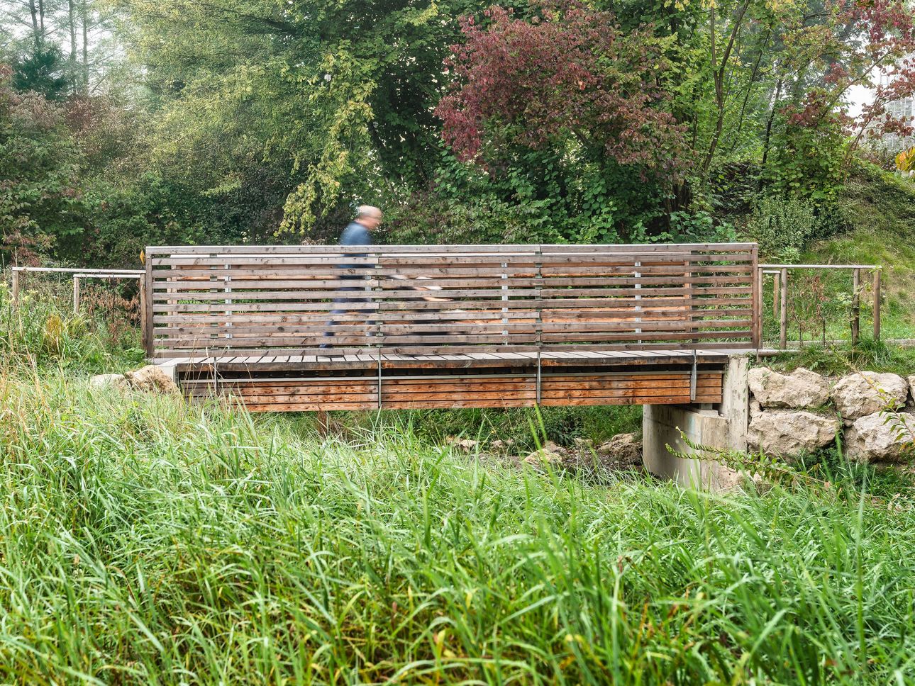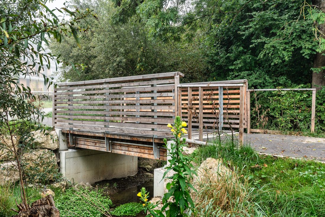 Gleich zwei Fussgängerbrücken aus Schweizer Holz durften wir 2024 über das Rombachbächli bauen. Ein Bericht zum Hochwasserschutz des Baches hatte ergeben, dass die bestehenden Brücken eine zu geringe Durchflusskapazität aufwiesen und deshalb ersetzt werden mussten. Jetzt kann das Rombachbächli an zwei Stellen wieder sicher und bequem überquert werden.
