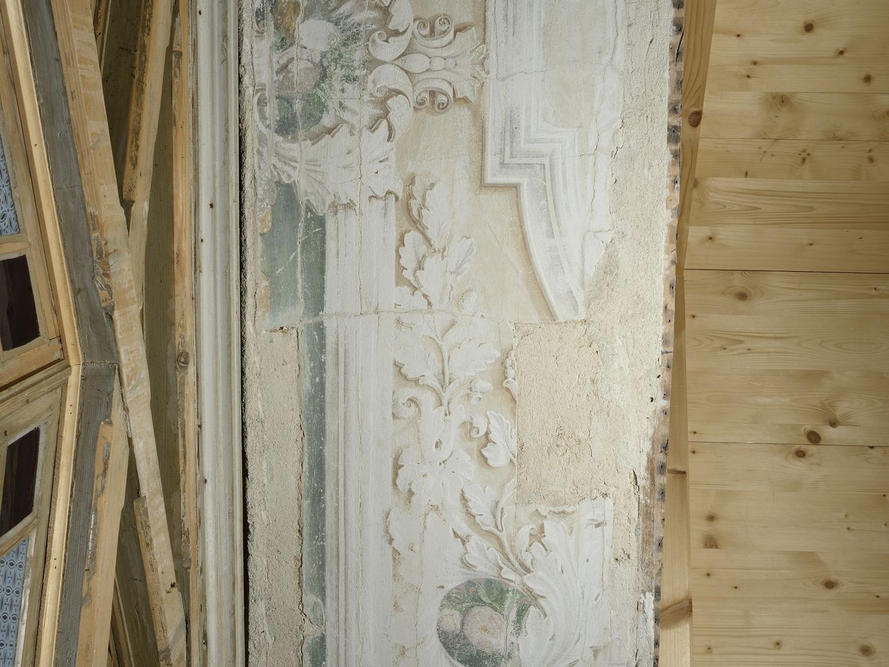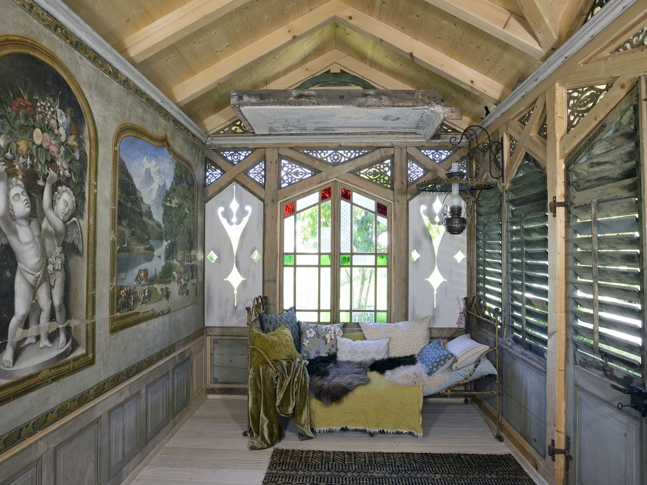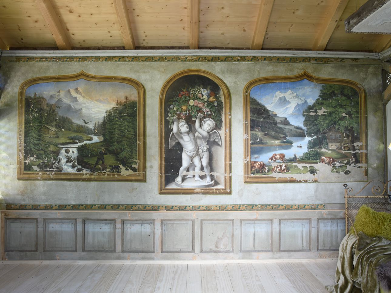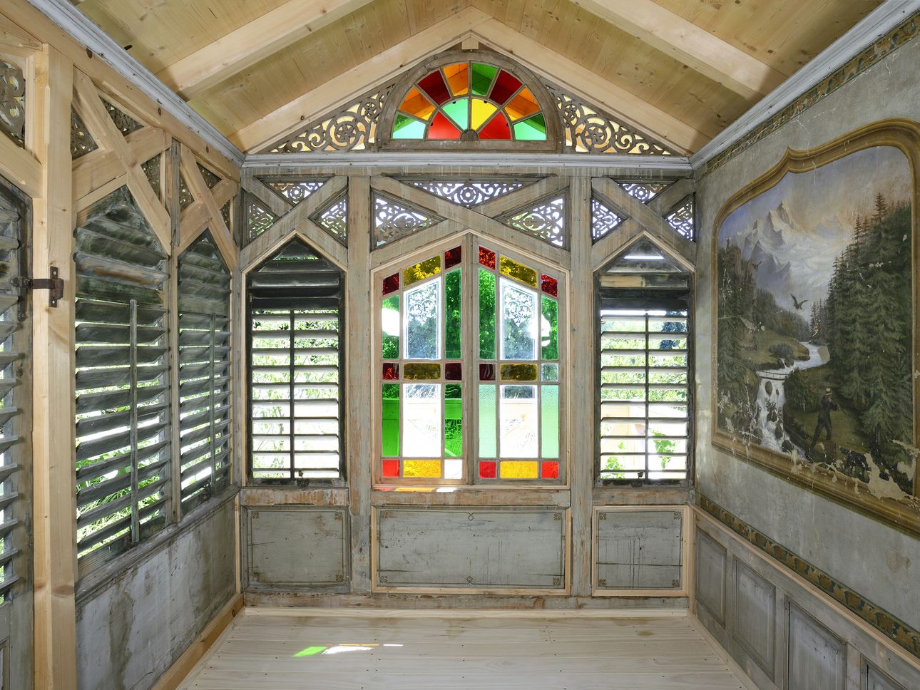 In unserer Produktionhalle in Dottikon wurden die defekten Stützen, Pfetten und Streben saniert. Die Füllungen wurden ersetzt, die Buntglasfenster, die Holzläden und Tore geflickt. Die Sparrenlage, die Zangen und Stützen mussten komplett neu produziert werden. Die wunderschönen geschnitzten Zierelemente und Wandmalereien wurden wieder aufgefrischt.
