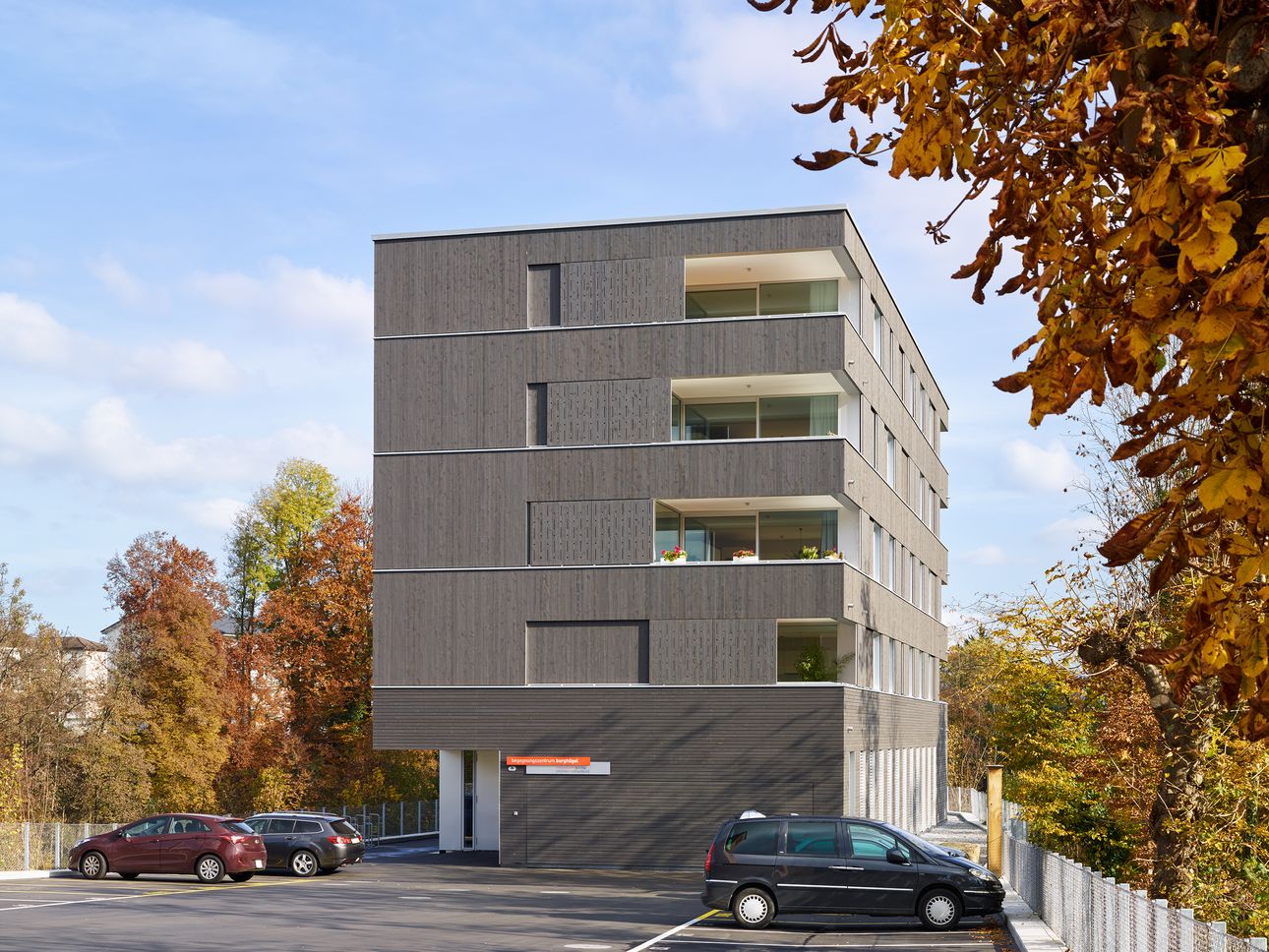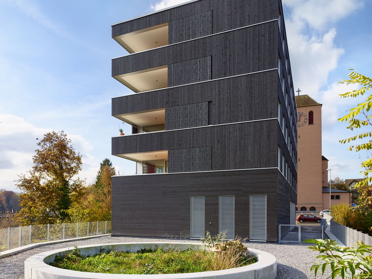 Das Erdgeschoss sind Büroräume und ein grosser Gemeindesaal untergebracht. In den 4 oberen Geschossen wurden Wohnungen ausgebaut. Damit die Kirche nicht zu sehr konkurriert wurde durch den Neubau, wurde für die Fassade in Zusammenarbeit mit dem Heimatschutz ein dunkler Farbton gewählt, welcher auf die umliegenden Dächer abgestimmt ist und das Gebäude kleiner erscheinen lässt.