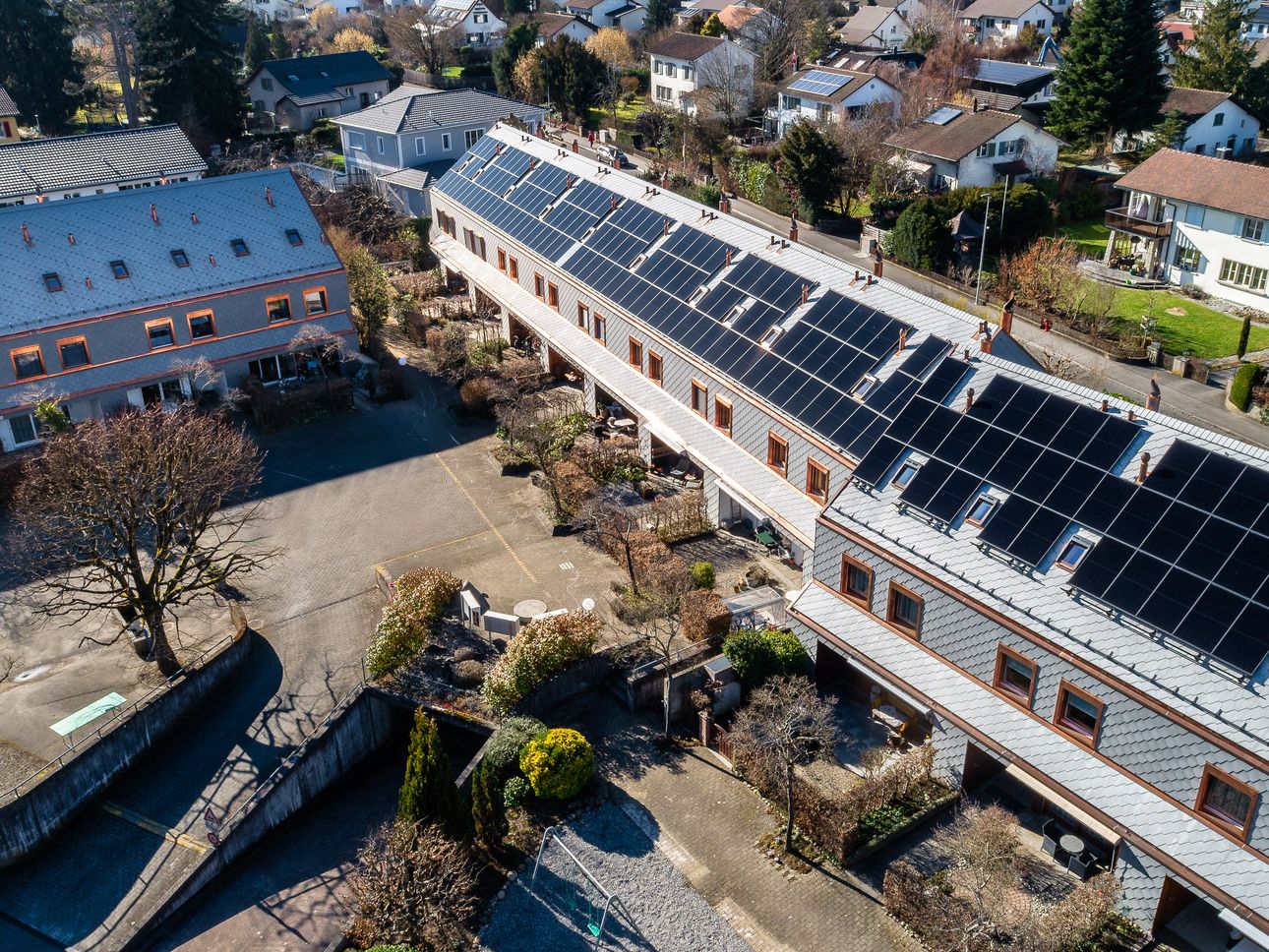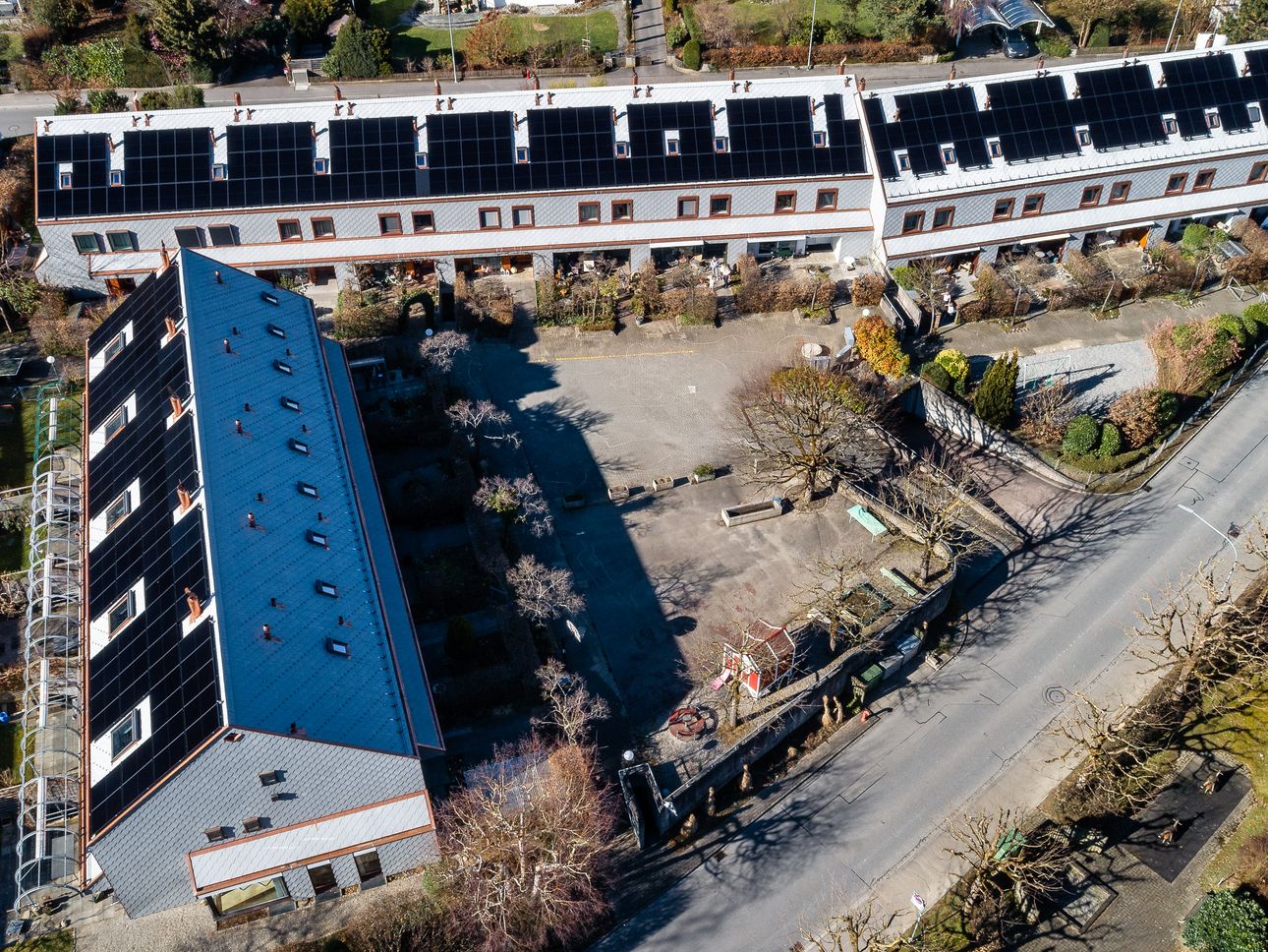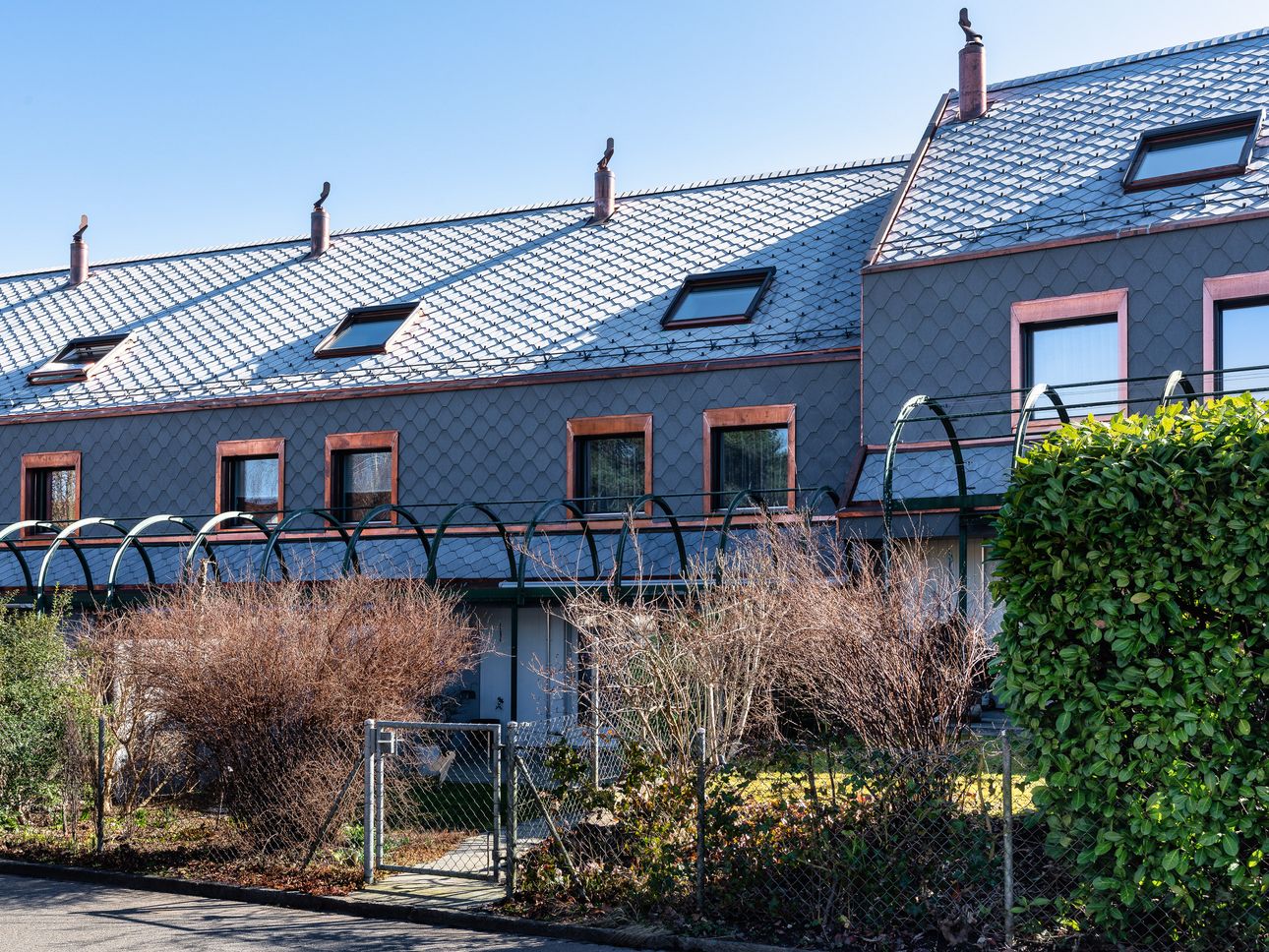 Gebaut wurden die Häuser anfangs der 80er Jahre, 2025 wurden sie durch uns energetisch saniert – für ein nachhaltigeres Wohnen dank besserer Dämmung, einer neuen Fassade und einem neuen Dach, einer PV-Anlage sowie neuen Dachfenstern.