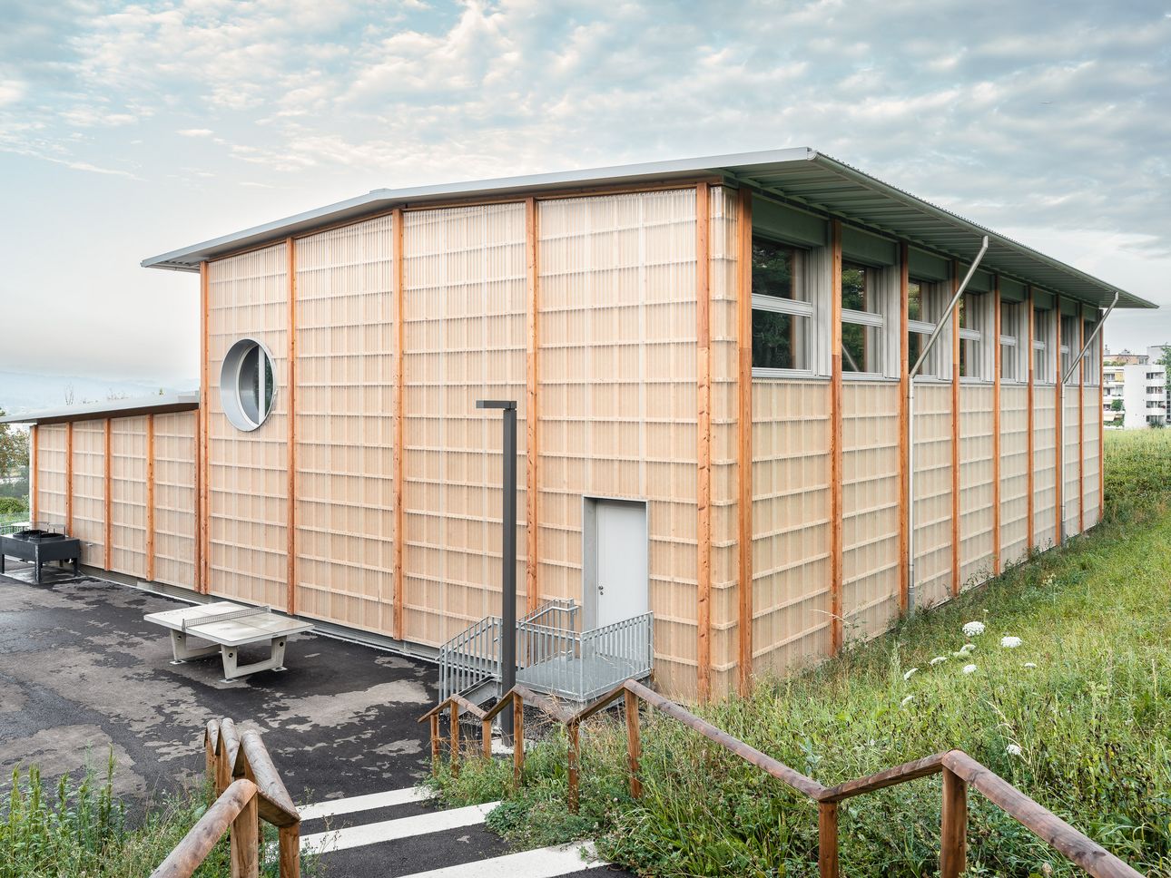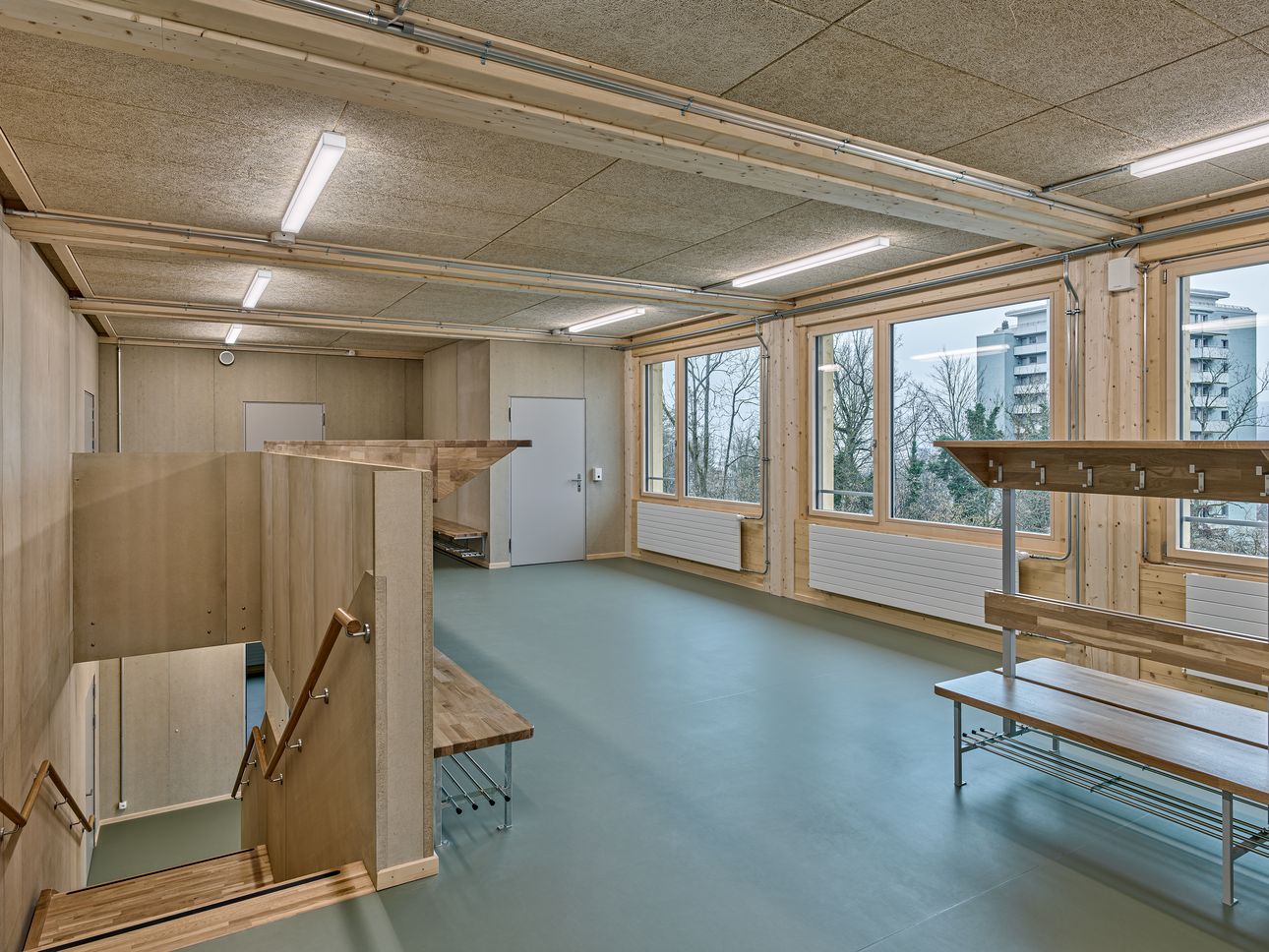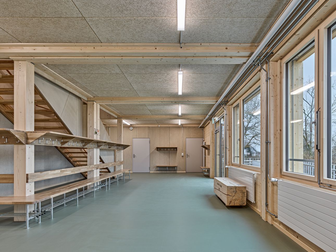 Die Architektur für die temporäre Turnhalle stammt von den pool Architekten, die auch die Sporthallen bei den Schulhäusern Hans Asper und Döltschi realisiert haben.