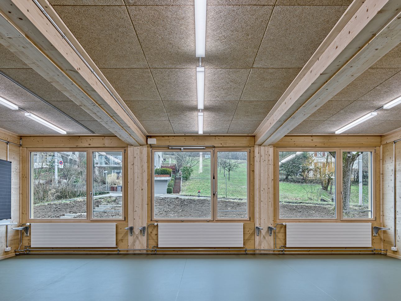 Beim Schulhaus Riedhof in Zürich Höngg entstanden zwei temporäre Bauten: eine Turnhalle und ein Schulhaus aus Holz. Die Modulbauten wurden in unserer Produktionshalle in Dottikon vorgefertigt, z.B. die Deckenelemente mit integriertem Unterlagsboden und fertiger Akustikdecke für das Schulhaus.