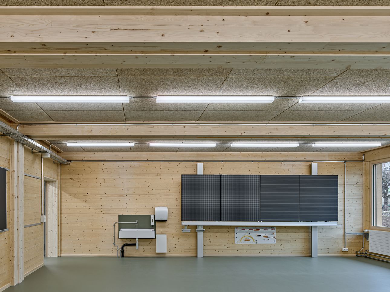 Dank dieser präzisen Vorfertigung erfolgte die Montage vor Ort im Turbomodus: innert nur 2.5 Stunden waren anfangs September 2023 der gesamte Boden der temporären Sporthalle verlegt und nach einem Tag standen bereits stolze 38 Elemente an Ort und Stelle. In den ersten zwei Oktoberwochen wurde dann auch das provisorische Schulhaus montiert.